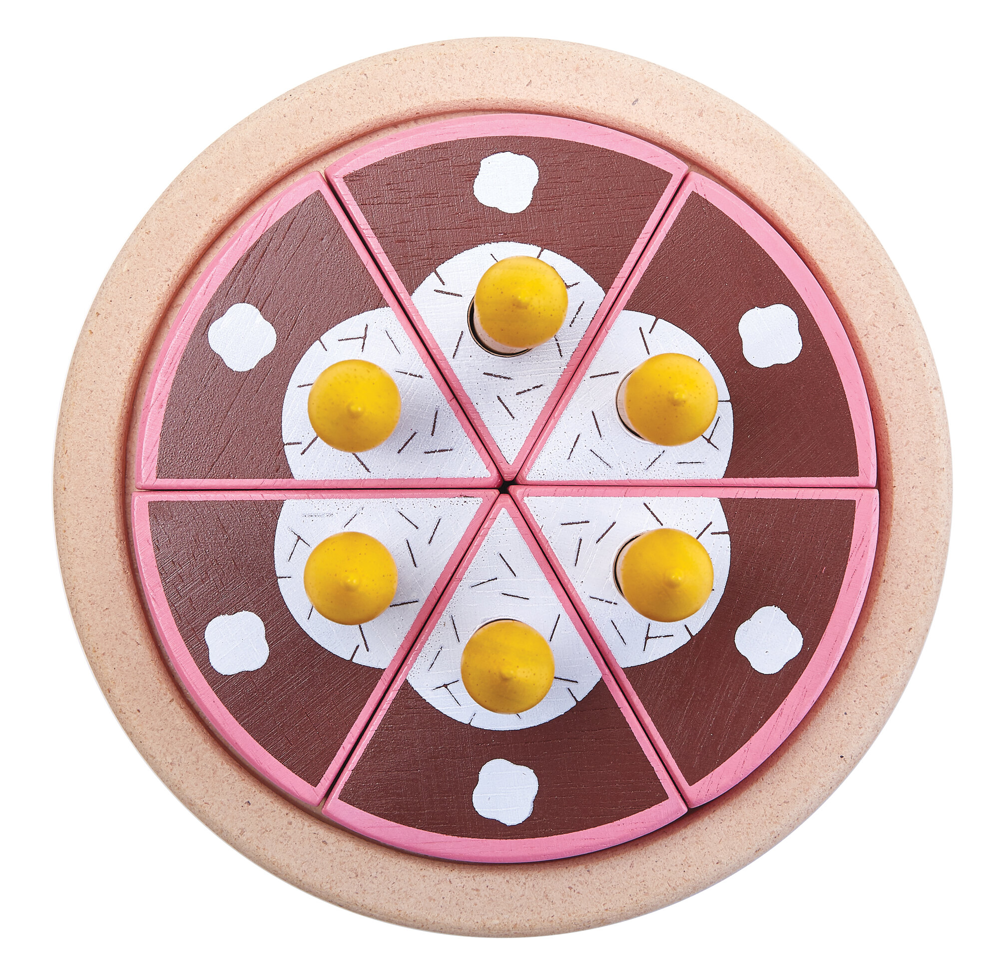 В набор входит 6 кусочков торта с двусторонним рисунком, свечи, маленькая грифельная доска, ножик и подставка