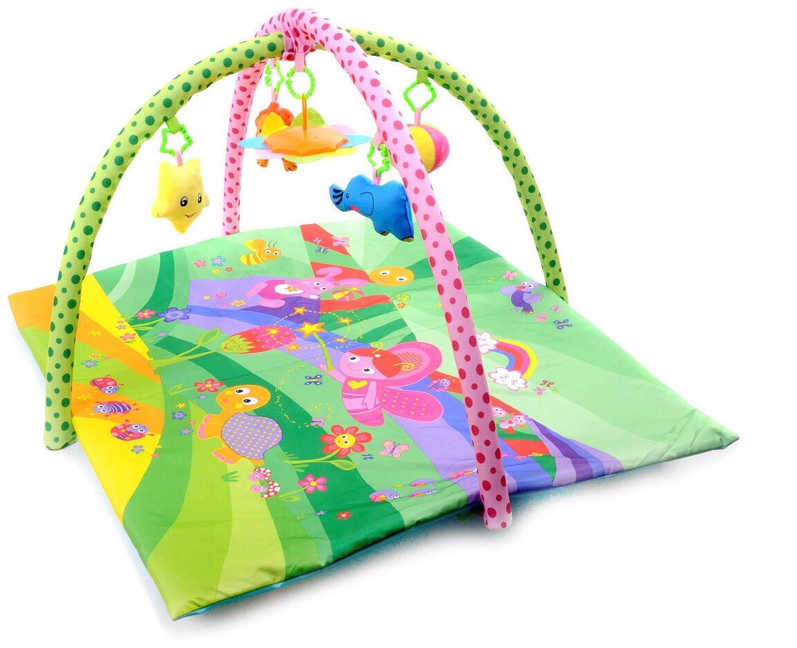 Качественные и мягкие материалы способствуют хорошему настроению ребенка. Коврик оснащен погремушками, которые привлекут внимание малыша.