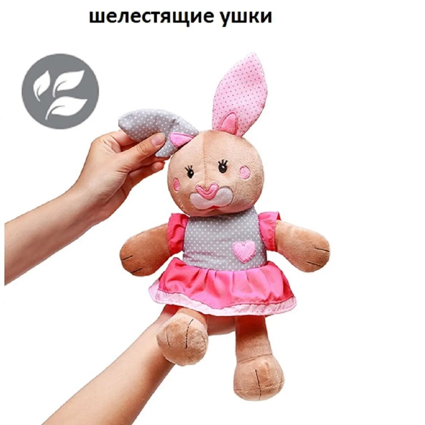 Bunny всей своей приятной наружностью вызывает желание обнять и поиграть с нею. Мягкая игрушка может стать первой и лучшей подружкой каждой девочки. Одежда зайчика выполнена из разной - фактурного материала, шелестящие ушки и внутренняя погремушка развивают познавательные навыки.