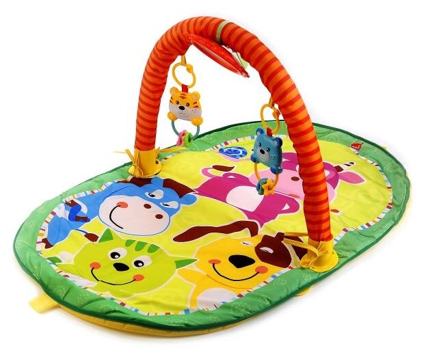 Коврик выполнен из приятной на ощупь ткани и дополнен изнутри мягкой прослойкой. Поверхность коврика оформлена в виде большой красочной аппликации с изображением симпатичных зверюшек. Игровой (активный) коврик удобен для хранения и переноски. В комплекте 2 съемные игрушки, съемная безопасная дуга. Детали коврика выполнены из разнофактурных материалов, что способствует развитию у ребенка тактильных ощущений и совершенствованию мелкой моторики. Развиваем: