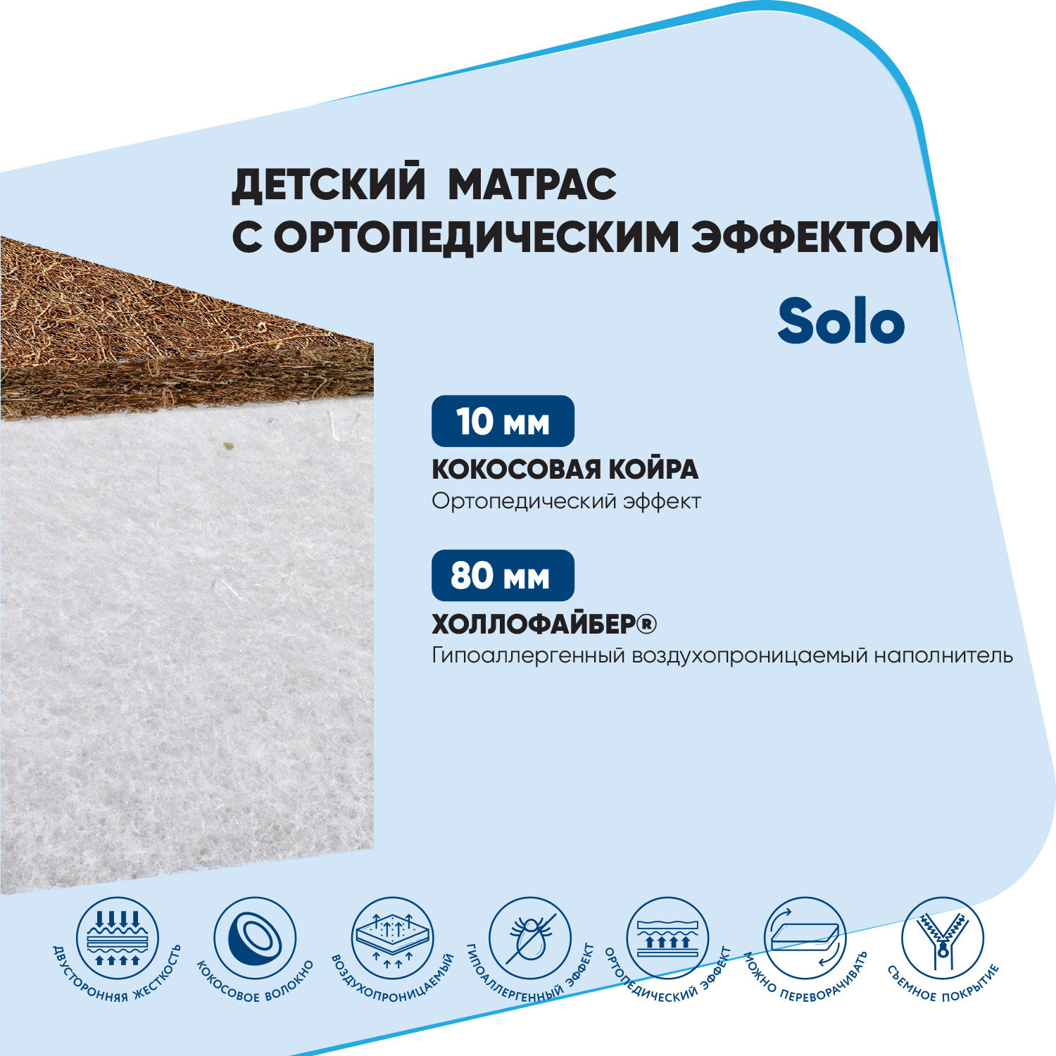 Кокосовая койра - натуральный жесткий материал, который пропускает воздух, не впитывает запахи, влагу, препятствует размножению постельных клещей, бактерий и микроорганизмов.