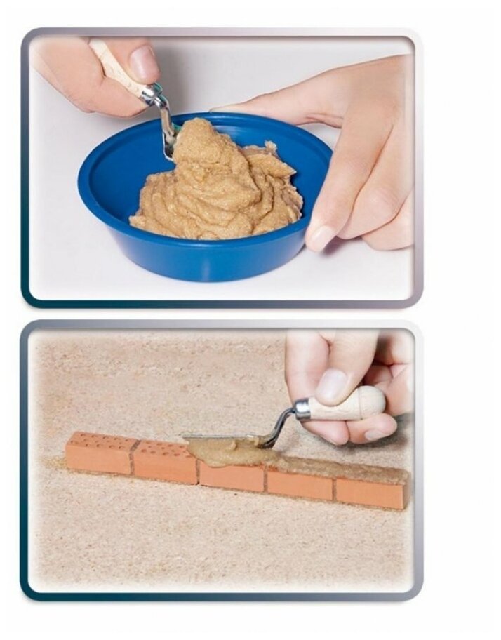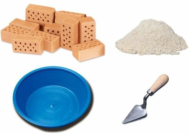 | Комплект поставки | 120 кирпичиков, строительная смесь, миска для приготовления раствора, настоящий детский мастерок, коврик для постройки, инструкция. |