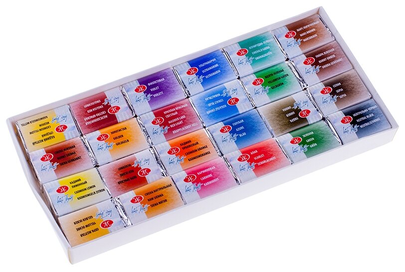 Состав набора кадмий лимонный, кадмий желтый средний, охра желтая, сиена натуральная, золотистая, кадмий оранжевый, охра красная, сиена жженая, железоокисная светло-красная, алая, краплак красный светлый, карминовая, фиолетовая или фиолетово-розовая, ультрамарин, кобальт синий, голубая, изумрудно-зеленая, желто-зеленая, зеленая, умбра, марс коричневый, умбра жженая, сепия, нейтрально-черная