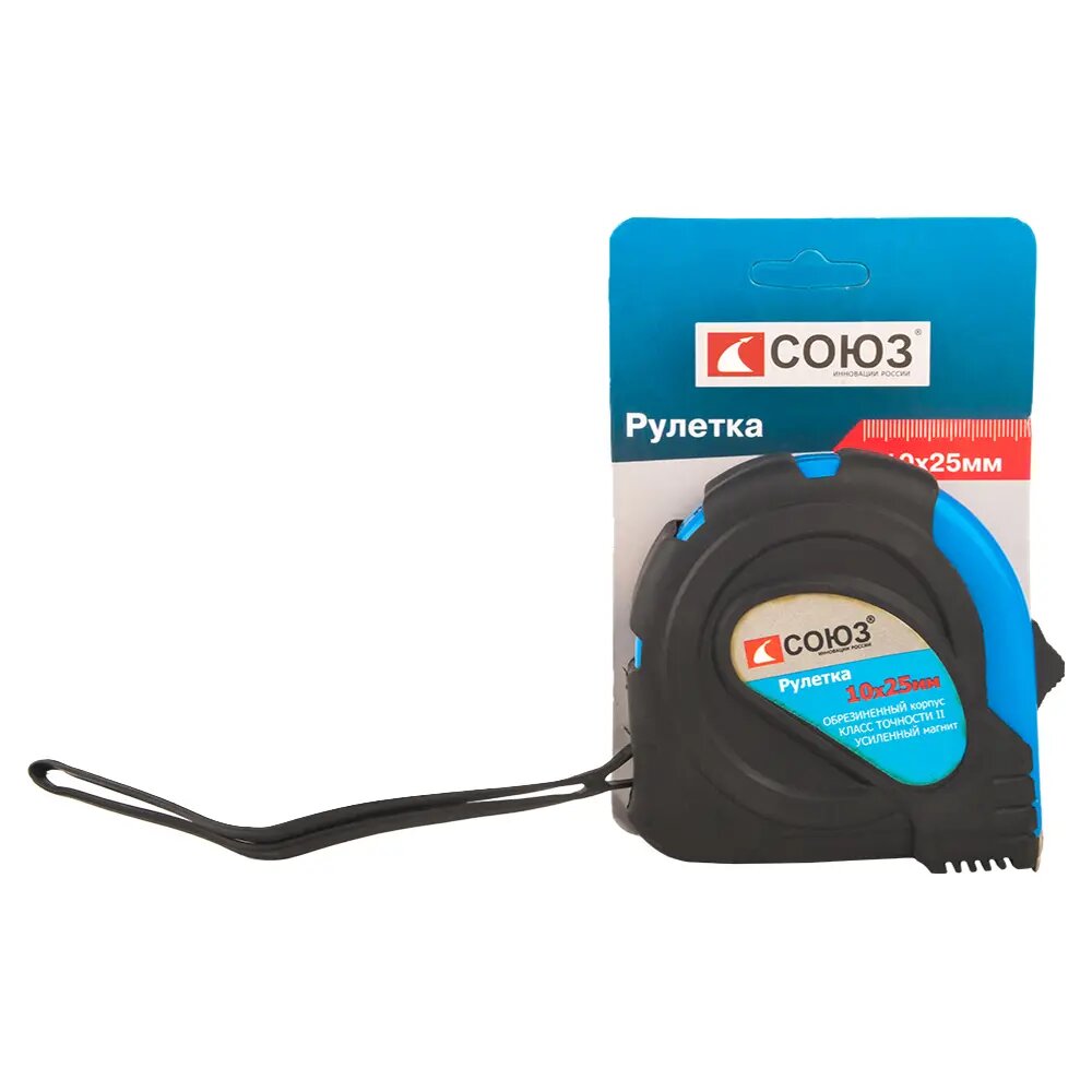 Рулетка СОЮЗ (арт. ) используется для измерительных работ в быту, при строительстве, на производстве и пр. Длина двусторонней измерительной шкалы белого цвета 10 метров. Полотно выполнено из термообработанной стали, имеет увеличенную стойкость к излому. Обрезиненный корпус прочен и долговечен. Усиленный магнит на зацепе помогает удерживать ленту на металлических поверхностях. Ручная фиксация надежного стопора повышает удобство работы.