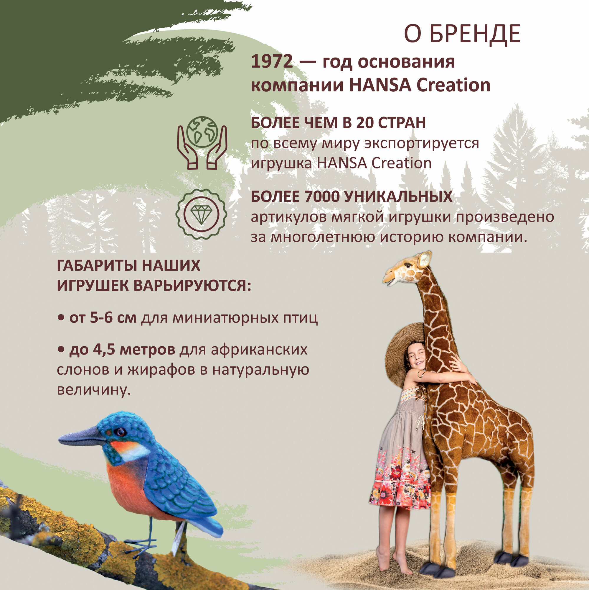Игрушки Hansa идеальны для модных интерьеров в африканском или японском стиле. Благодаря своей реалистичности игрушки Hansa имеют огромное природоохранное значение - они позволяют любоваться дикими животными, сохраняя им жизнь.