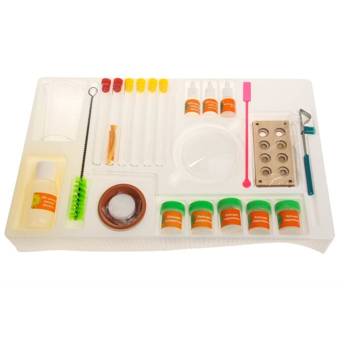 Комплектация | 10% раствор азотной кислоты, 10% раствор соляной кислоты, 10% раствор фенолфталеина, бумага индикаторная лакмусовая нейтральная, ершик для пробирок, инструкция, кальций хлористый, кальция гидроокись, компакт-диск с видео, перчатки, пипетка Пастера, подста |