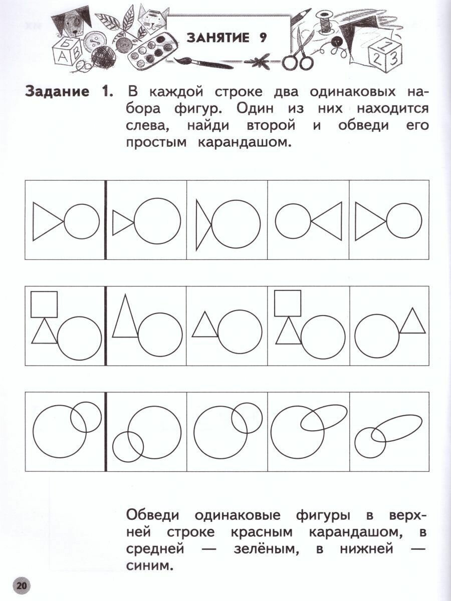 Все занятия однотипные, каждое занятие состоит из двух упражнений. Иллюстрация, приведенная Лабиринтом, вполне дает представление о том, как это выглядит. В первом надо находить из 4 фигур (символов, цифр, букв) ту, которая соответствует образцу, во втором задании надо среди хаоса линий найти нужную фигуру. Задания постепенно усложняются, в последних заданиях надо сосчитать на картинке количество кругов, прямоугольников, треугольников. Фигуры коварно спрятаны. В конце книге родителям даны подсказки: пару раз я сама не с первого раза нашла все фигуры. Мальчику 6 лет понравилось, в начале было просто, делали сразу 2-3 задания, под конец стало непросто. Главное, не подсказывать, а дать возможность постепенно найти все фигуры, пусть за несколько раз.