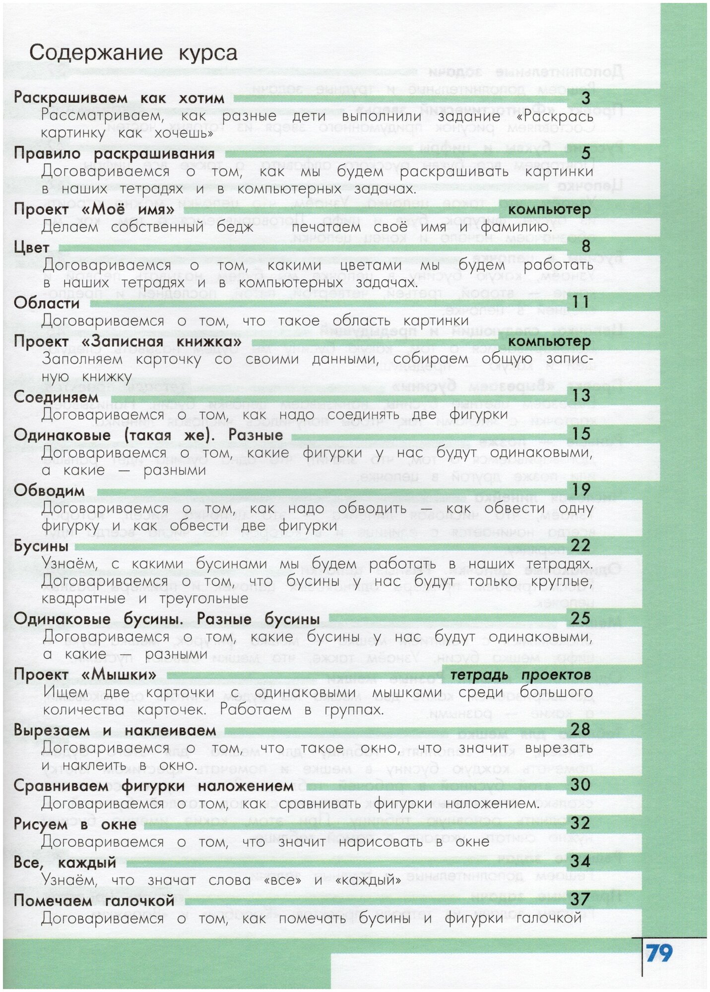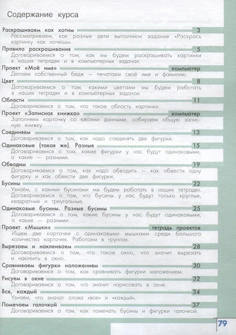 Курс "Информатика" рассчитан на обучение в течение четырех лет в объёме 34 ч в год. Программа курса предусматривает несколько различных вариантов работы, в том числе как с использованием средств ИКТ, так и бескомпьютерный вариант. В материалы каждого года обучения входят учебник, рабочая тетрадь, тетрадь проектов, компьютерная составляющая и методическое пособие для учителя. Электронная версия книги для учителя размещена на сайтах издательства.