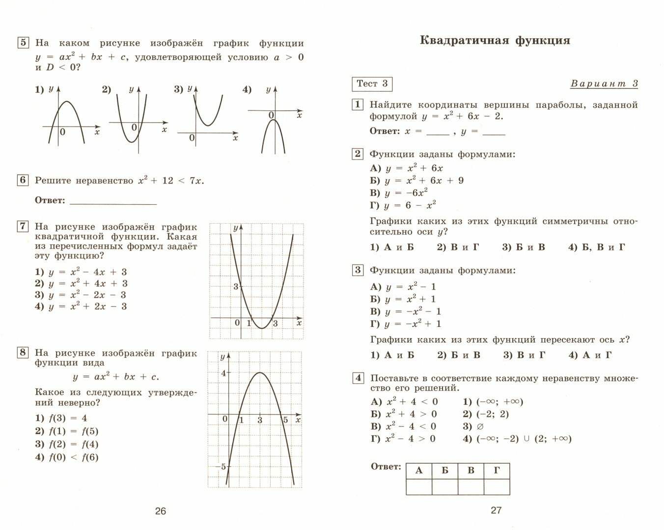Учебное пособие содержит 10 тематических тестов к учебнику "Алгебра. 9 класс" Г. В. Дорофеева и др. а также 2 итоговых теста: за курс алгебры 9 класса и за курс 7-9 классов. Все тесты даны в четырёх вариантах. Цель книги - достижение каждым учащимся уровня базовых знаний. Ко всем заданиям тестов приведены ответы.