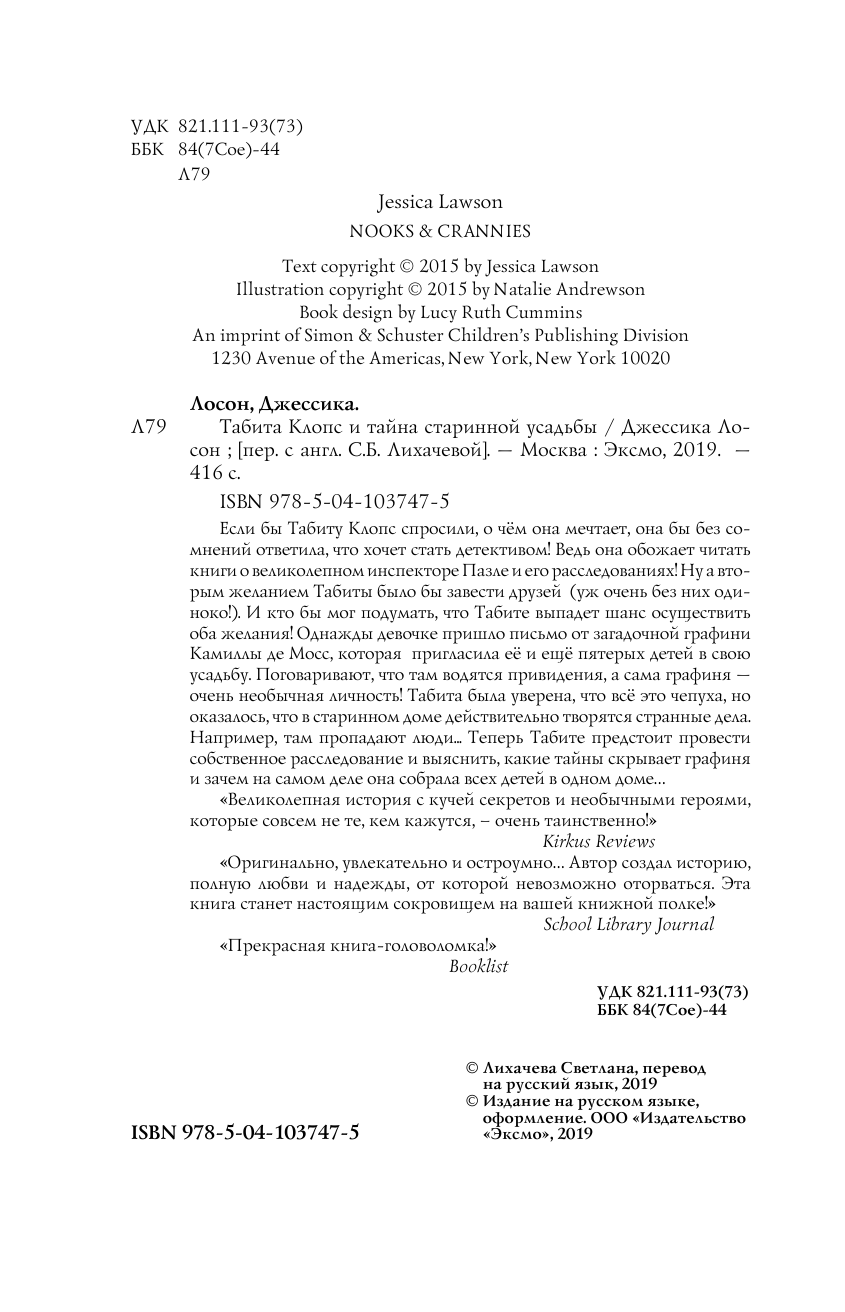 Джессика Лоссон. "Табита Клопс и тайна старинной усадьбы". Филиал "Залесская сельская библиотека"