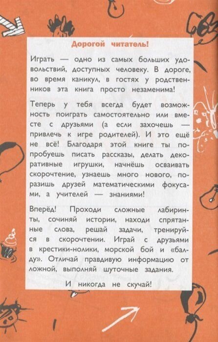 Основная цель книги — организовать досуг ребёнка интересно и с пользой. Каждая страница представляет собой развлекательную или познавательную игру, в которую можно поиграть одному, в компании друзей или всей семьёй. Познавательные и занимательные задания по математике, русскому языку, природоведению ненавязчиво интегрированы в структуру пособия. Ребёнок будет применять знания, выполняя весёлые необычные задания и процесс обучения, и повторения школьного материала воспримет как интересную игру. В книге собраны любимые игры всех поколений школьников: морской бой, крестики-нолики, алфавитка, "балда", "ладошки", кроссворды, анаграммы, а также современные упражнения в скорочтении и многие другие увлекательные и полезные упражнения. Благодаря этой книге ребёнок расширит кругозор и приобретёт новые знания, разовьёт творческий потенциал. Адресовано младшим школьникам и их родителям для организации полезного досуга.