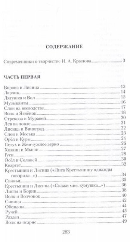 В первую часть книги включены наиболее известные басни И. А. Крылова, знакомые читателям ещё со школьных лет. Во вторую часть вошли басни, многие из которых написаны на сюжеты предшественников автора - Эзопа, Федра, Бабрия, Лафонтена и др. Крылов не боялся обращаться к сюжетам уже знакомым, зачастую не только заново обыгрывая традиционную ситуацию, но и вкладывая в неё новый смысл, перенося на почву близкой ему русской действительности. Под пером великого баснописца знакомый сюжет приобретал жизненную правдивость, прозрачность и точность.
