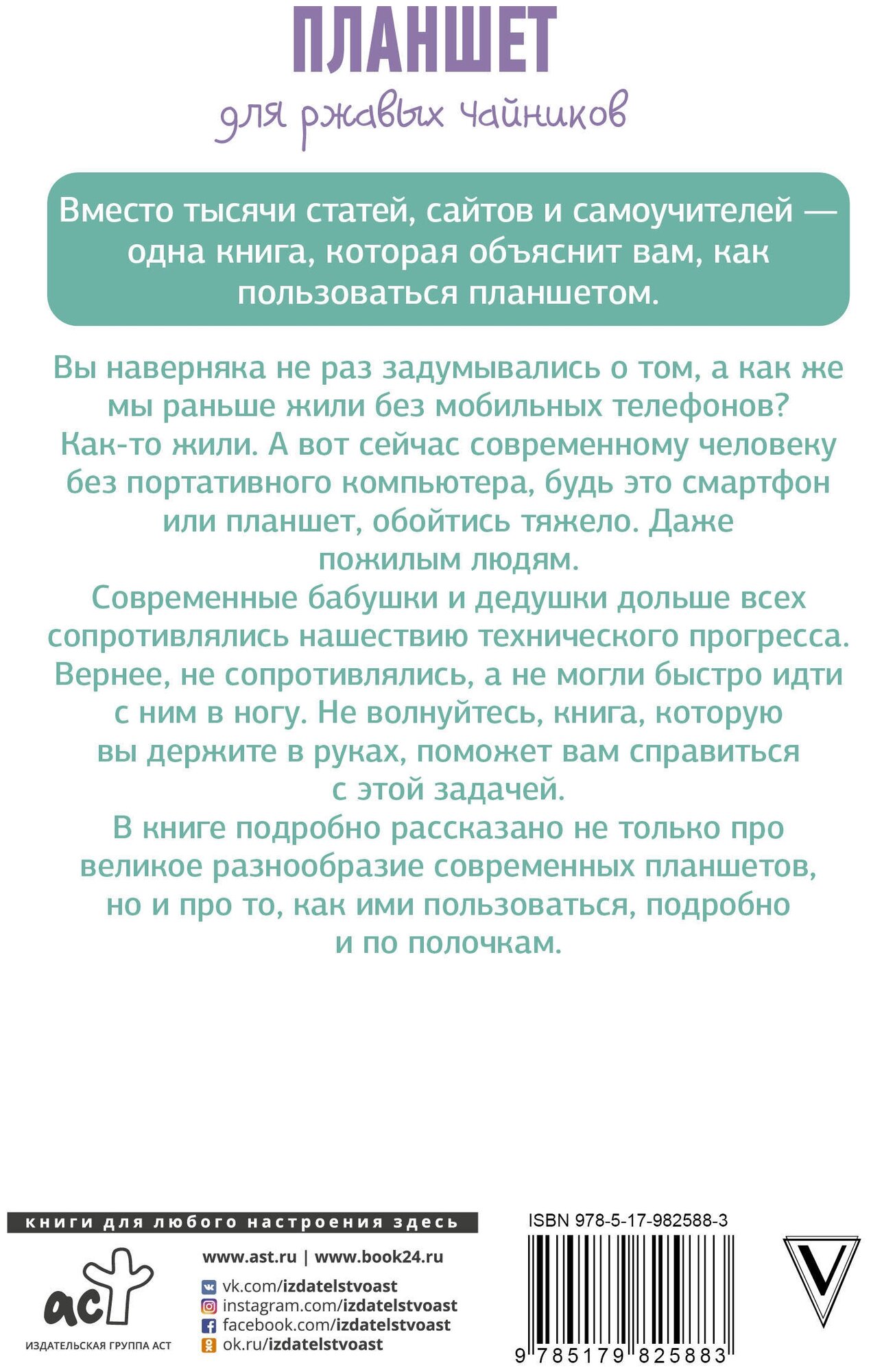 Книга написана живым понятным языком, с очень подробными разъяснениями и советами, начиная от самых азов : как включить , как настроить, как выбрать приложение, как пользоваться, что такое интернет, зачем он нужен и как им пользоваться и т.д. в общем книга подойдет абсолютным новичкам, которые ни разу в жизни не держали в руках ни планшет ни смартфон. Для бабушек и дедушек очень хороший путеводитель в приобщении к миру цифровых гаджетов, где подробно и в доступной форме всё разжевано и разложено по полочкам . Сама книга в твёрдом переплёте с чёрно-белыми картинками.