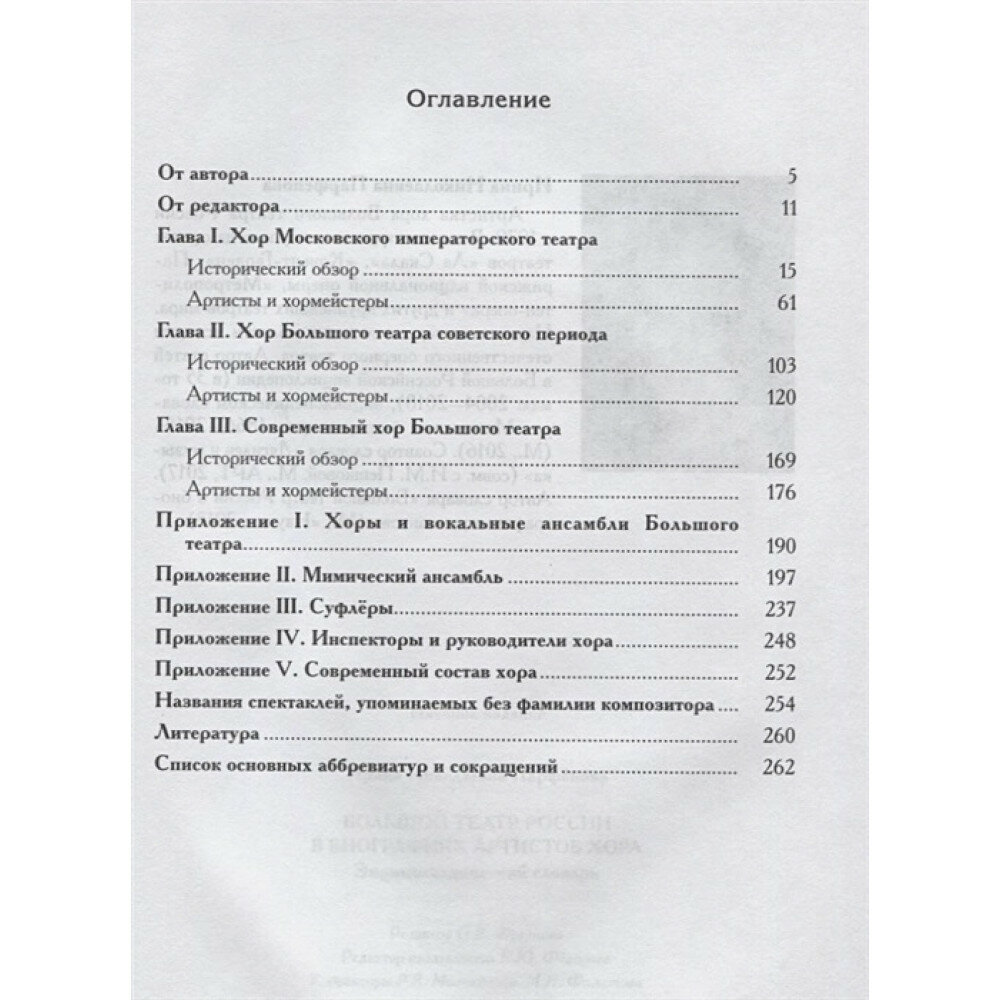 Книга представляет собой очередное издание энциклопедического словаря об артистах Большого театра России. Предыдущее издание "Большой театр России в биографиях музыкантов" увидело свет в 2018 году. Данный словарь посвящён артистам хора. В трёх главах книги отражены события и факты трёх эпох в истории хора: императорского театра, советского и постсоветского периодов. Каждая глава представляет собой блок из двух разделов - исторического обзора и организованной по алфавиту словарной части. Словарную часть составили справки об артистах хора и хормейстерах Большого театра. Три главы дополнены приложениями, в которых приводятся данные о детском хоре и о вокальных ансамблях, работавших в разное время в Большом театре, впервые собраны воедино сведения о мимическом ансамбле и суфлёрах, дан полный состав хора на конец 2018 года. Многие сведения публикуются впервые: это почти все данные по столетней истории хора с конца 18 века; уникальные подробности организации первого, в современном смысле профессионального, хора Большого театра в 1882 году; значительная часть архивных данных советского периода.