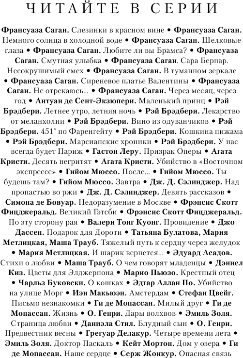 Современная книга о современных людях во Франции, но не с современным сюжетом. Я имею ввиду, что мне кажется совершенно не реалистичным написанное на страницах этой 'карманной' книги. Сюжетная линия скорее не линия, а кусочно-заданная функция с кучей точек разрыва, мне было сложно создавать в голове единую картинку. Книга в сумочку - подходящее описание. Не советую как серьёзное чтиво, но чтобы уснуть в метро - подойдёт