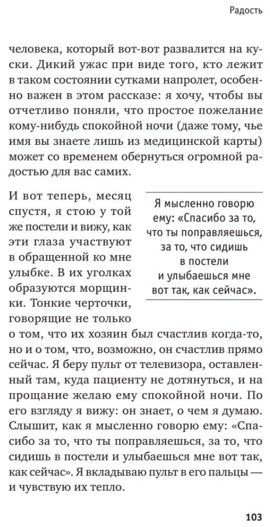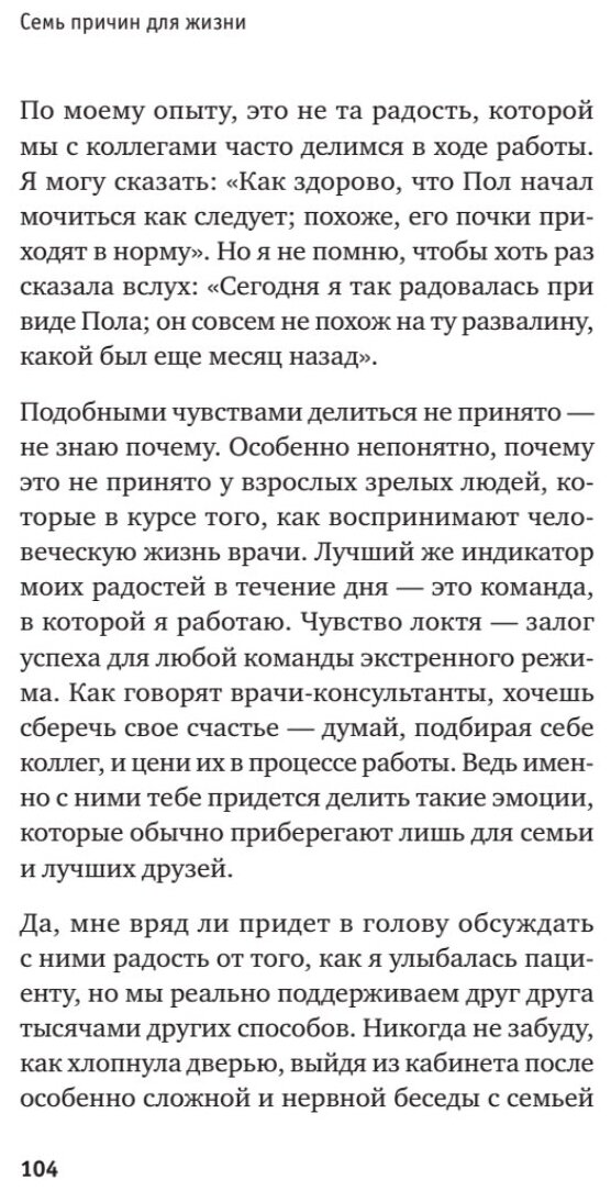 Она врач-реаниматолог. Она несет вахту на границе жизни и смерти. Каждый день она переживает страх, гнев, отчаяние, надежду десятков незнакомых ей людей. В стенах больницы о том, что она чувствует, не должен знать никто. Но в этой книге доктор Ифа Эбби расскажет о семи эмоциях, которые помогают ей удерживать людей по эту сторону жизни, мириться с неизбежным, преодолевать страх фатальных ошибок и никогда не терять надежду. О семи эмоциях, которые позволяют ей чувствовать себя живой и понимать, зачем она живет. Истории врача, ежедневно вступающей в схватку со смертью, и ее пациентов, непохожих друг на друга, помогут каждому найти семь своих причин для жизни.