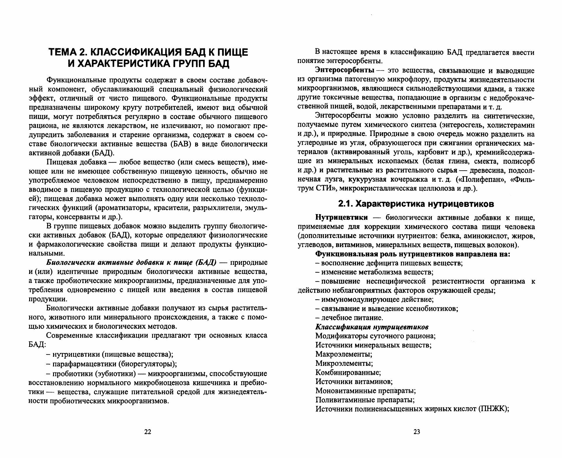 Представлены основные темы изучаемого раздела, в которых рассмотрены основные нормативные и технические документы, используемые для регулирования вопросов специализированного питания, описаны биологически активные вещества в функциональных продуктах питания, представлена классификация биологически активных добавок к пище. Рассмотрены характеристики групп БАД (нутрицевтики, парафармацевтики, эубиотики), функциональные аспекты питания разных групп населения: спортивное питание, питание туристов и питание в лечебно-профилактических учреждениях (ЛПУ), приведен перечень практических работ и указания к их выполнению, даны контрольные вопросы по каждой теме для проверки знаний студентов, представлен примерный перечень рефератов для закрепления материала, пример тестового задания, глоссарий, а также список рекомендуемой литературы.