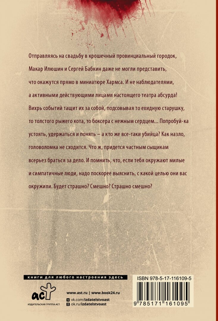 Отправляясь на свадьбу в крошечный провинциальный городок, Макар Илюшин и Сергей Бабкин даже не могли представить, что окажутся прямо в миниатюре Хармса. И не наблюдателями, а активными действующими лицами настоящего театра абсурда! Вихрь событий тащит их за собой, подсовывая то ехидную старушку, то толстого рыжего кота, то боксера с нежным сердцем... Попробуй-ка устоять, удержаться и понять - а кто же все-таки убийца? Как назло, головоломка не сходится. Что ж, придется частным сыщикам всерьез браться за дело. И помнить, что, если тебя окружают милые и симпатичные люди, надо поскорее выяснить, с какой целью они вас окружили. Будет страшно? Смешно? Страшно смешно?