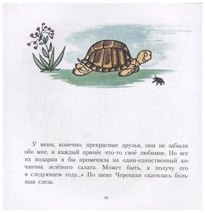 В книгу вошли три оригинальные сказки немецкой художницы ирландского происхождения Элизабет Шоу: "День рождения Черепахи", "Улитка Каролина", "Кабанёнок Кузя". Имя Элизабет Шоу знают все, кто рос в ГДР в 1960-1980х годах, и при одном его упоминании расплываются в широкой улыбке - ведь именно ее книги были самыми любимыми у нескольких поколений детей Восточной Германии. "День рождения Черепахи": у Черепахи была заветная мечта: получить на день рождения кочан сочного зеленого салата. Но никто из ее друзей почему-то не догадался преподнести ей именно такой подарок. Они от чистого сердца дарили Черепахе подарки, которым охотнее порадовались бы сами: Лев принес кусок сырого мяса, Слон - ведро освежающей воды, Пеликан - большую рыбину. Черепаха не обижалась, горячо благодарила друзей и тут же предлагала им самим воспользоваться принесенными дарами, чтобы доставить ей удовольствие. И только поздно вечером маленькая Мышка прикатила Черепахе огромный круглый сверток, перевязанный красивой лентой. Догадались, что в нем? Конечно, салат, иначе и быть не могло! Ведь если ты дружелюбный, искренний и отзывчивый, то все твои мечты рано или поздно обязательно сбудутся. "Улитка Каролина": улитка по имени Каролина была очень застенчивой и медлительной, поэтому никто не хотел с ней дружить. Божьи коровки и другие букашки только дразнили бедную Улитку за то, что у нее нет ни ног, ни крыльев, и она никогда не сможет летать. Каролина от этого очень расстраивалась и втайне надеялась, что вдруг когда-нибудь все же сможет взлететь. Однажды так и случилось: во время урагана ветер поднял в воздух листочек, на котором сидела Каролина, и перенес его на другой конец лужайки. Вследствие этого полета произошли две важные вещи: во-первых, Каролина раз и навсегда усвоила, что летать ей совершенно не нравится, а во-вторых, на другом конце лужайки она повстречала Альберта - такую же улитку, как и она. С тех пор они никогда не расставались и не спеша шли по жизни вместе. Мораль: не стоит переживаешь и