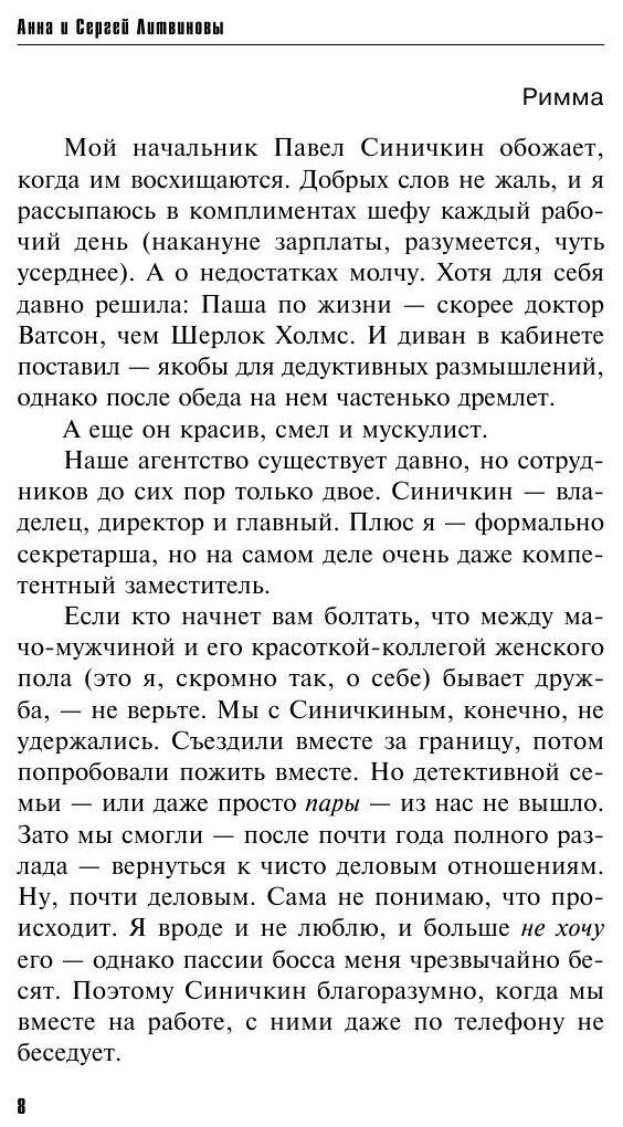 Книга включает три небольшие повести. В первой главное действующее лицо секретарь Паши Синичкина - Римма. Это самая большая история из трех, вначале она показалась довольно интересной, но несколько разочаровало окончание (зная Литвиновых, ждала большего). Вторая повесть о Татьяне Садовниковой в целом понравилась, но в силу небольшого объема не успеваешь проникнуться атмосферой книги, а она уже закончилась. А третья повесть, извините, вообще "не пойми что", бросила читать едва начав. В целом - средне, моя оценка 5 из 10. Для развлечения прочитать можно, но не "супер".