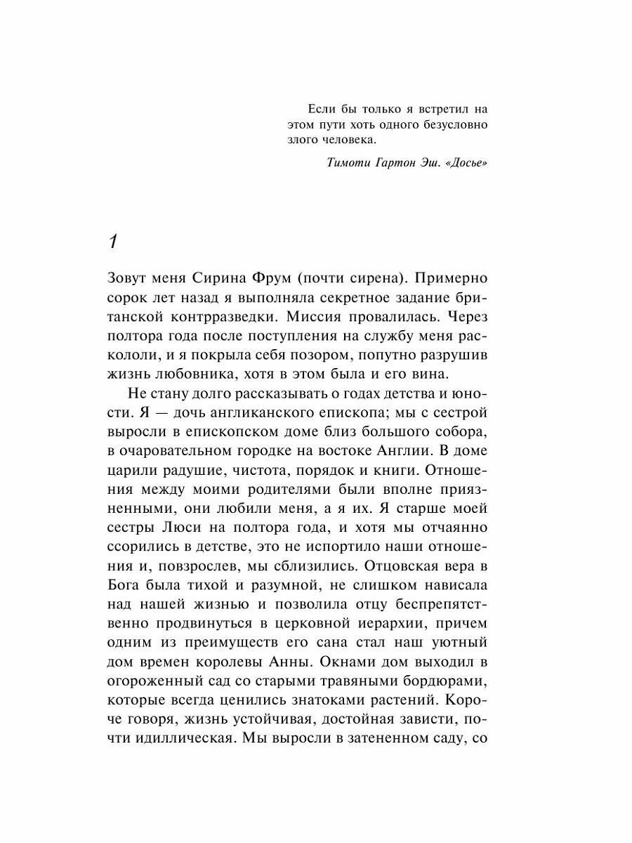 Вступительная часть романа обещает приключение в духе Джеймса Бонда, с интригами и опасностями, но все оказывается гораздо проще. История повествует о девушке, завербовавшей молодого автора Томаса Хейли. По классическому канону между ними вспыхивает страсть, и на пути юной и чистой любви встаёт вынужденная ложь о жизни мисс Фрум. Работа или личное счастье? Честность или создавшаяся идиллия? Вопросы, на которые неопытная Сирина должна ответить.