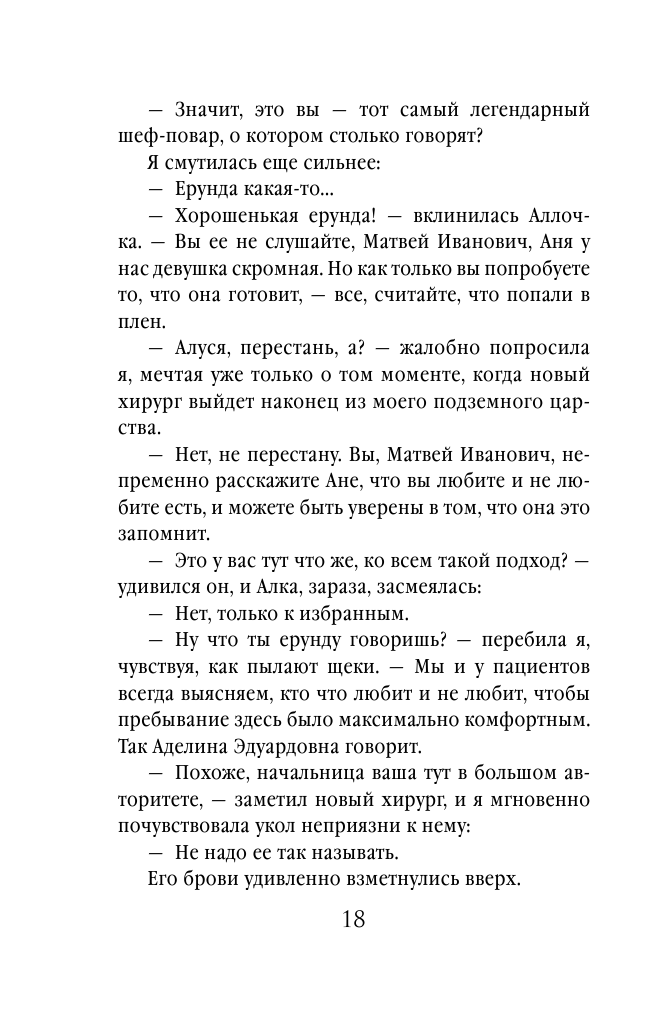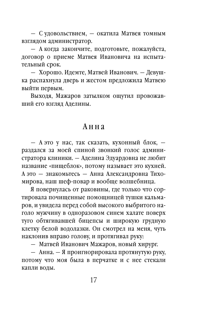 Автор неторопливо раскрывает каждого из героев, а затем объединяет эти сюжетные линии воедино. И если в начале книги задумываешься, как могут быть связаны владелица хирургической клиники Аделина, её брат, повар этой же клиники Анна и один из ведущих хирургов клиники Матвей Мажаров, то к финалу книги обнаруживается совершенно неожиданная развязка. Думаете, всех их объединяет клиника? - а вот и нет. Во всяком случае не только она.