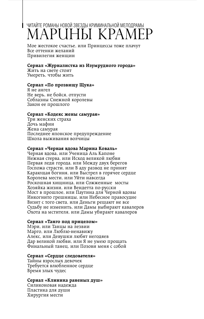 | Серия | Закон сильной. Криминальное соло Марины Крамер |