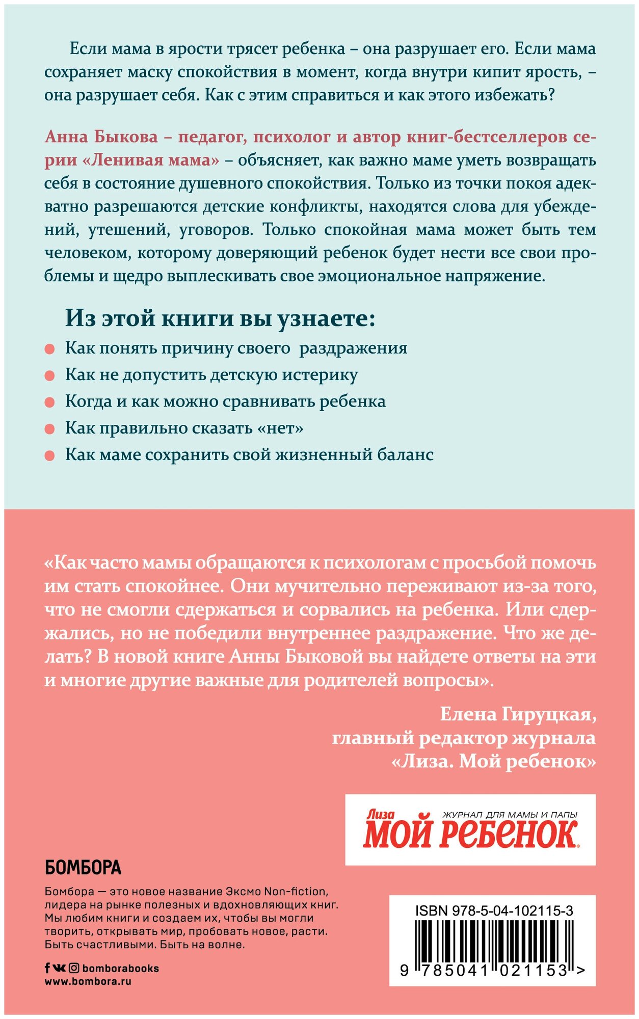 Если мама в ярости трясет ребенка - она разрушает его. Если мама сохраняет маску спокойствия в момент, когда внутри кипит ярость - она разрушает себя. Как с этим справиться и как этого избежать? Анна Быкова - педагог, психолог и автор книг-бестселлеров серии "Ленивая мама" объясняет, как важно маме уметь возвращать себя в состояние душевного спокойствия. Только из точки покоя адекватно разрешаются детские конфликты, находятся слова для убеждений, утешений, уговоров. Только спокойная мама может быть тем человеком, которому доверяющий ребенок будет нести все свои проблемы и щедро выплескивать свое эмоциональное напряжение.