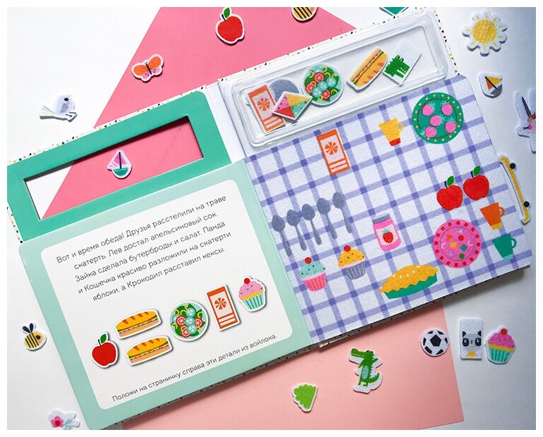 Сначала я подумала, что детали не будут крепиться к страницам (они из войлока без липучек), но я зря волновалась - они крепятся и держатся в любом месте.
