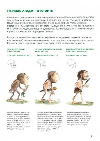 Не понравилась категорически, и прежде всего - иллюстрации. Первобытные люди на разных этапах развития изображаются одинаково, карикатурно-мультяшно. В итоге на картинке, иллюстрирующей прогресс, показан только переход к прямохождению, изменения в осанке. А где изменения в строении черепа (надбровные дуги, челюсти и пр.)??? Но нет, на картинке ничего этого нет, у людей разных периодов - одни и те же "рожи".