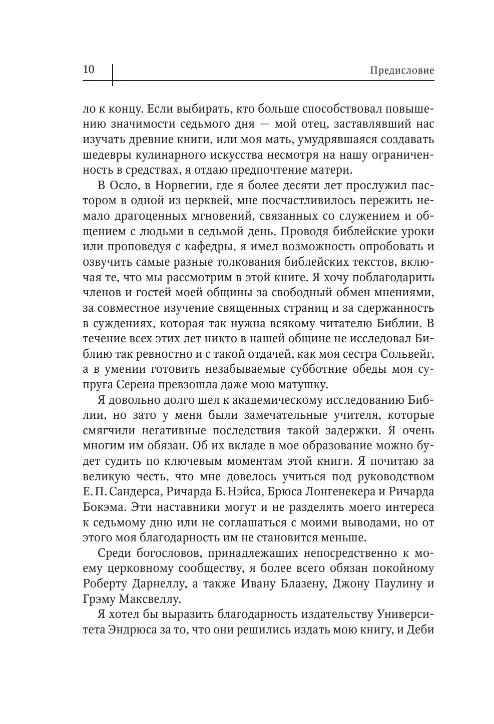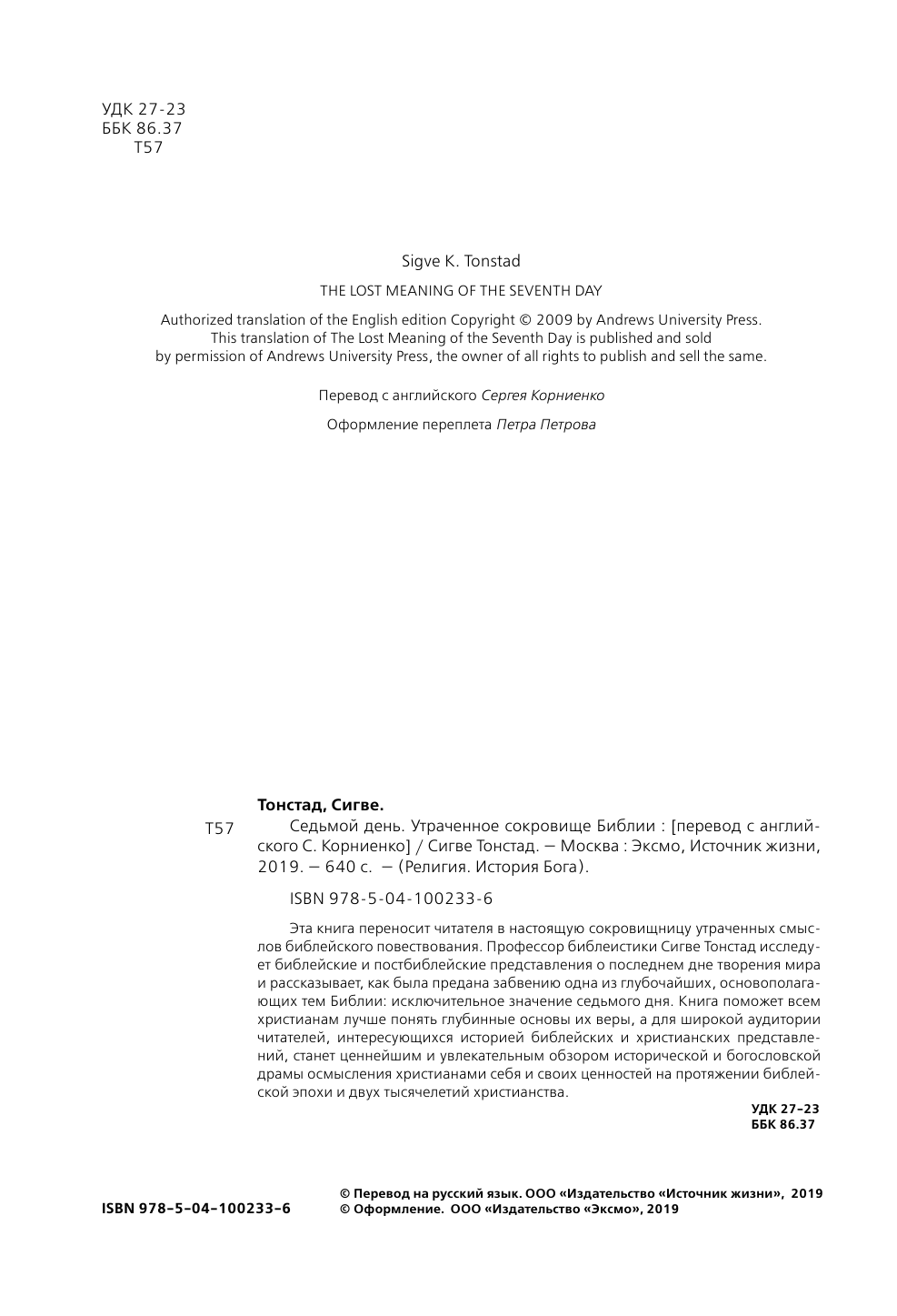 Эта книга переносит читателя в настоящую сокровищницу утраченных смыслов библейского повествования. Профессор библеистики Сигве Тонстад исследует библейские и постбиблейские представления о последнем дне творения мира и рассказывает, как была предана забвению одна из глубочайших, основополагающих, тем Библии: исключительное значение седьмого дня. Книга поможет всем христианам лучше понять глубинные основы их веры, а для широкой аудитории читателей, интересующихся историей библейских и христианских представлений, станет ценнейшим и увлекательным обзором исторической и богословской драмы осмысления христианами себя и своих ценностей на протяжении библейской эпохи и двух тысячелетий христианства.