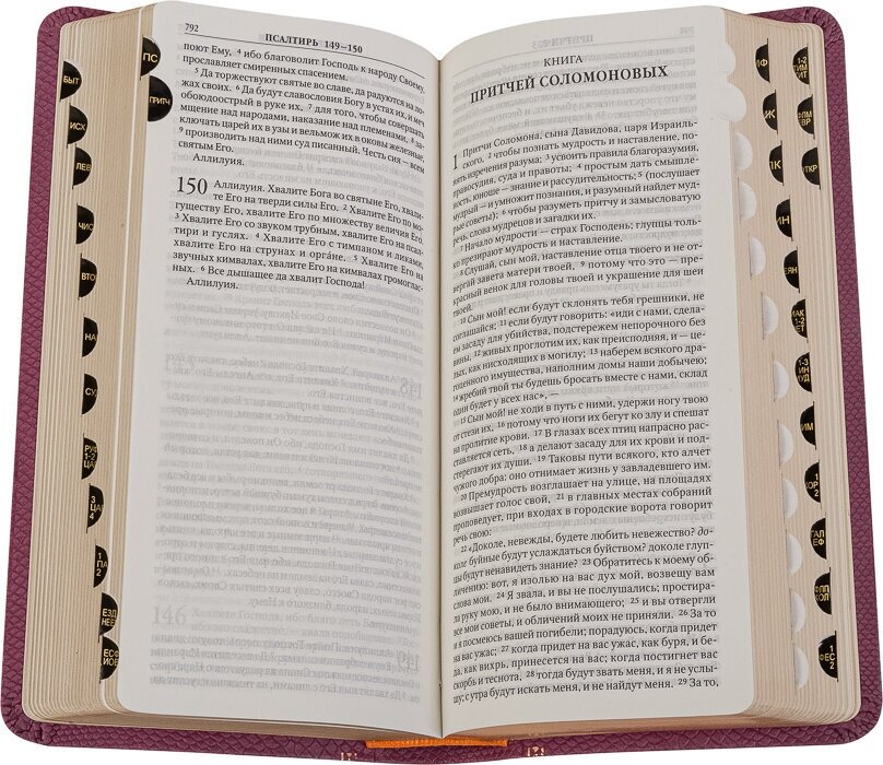 Переплет из экокожи, "золотой" обрез, закладка, индексы для поиска библейских книг.