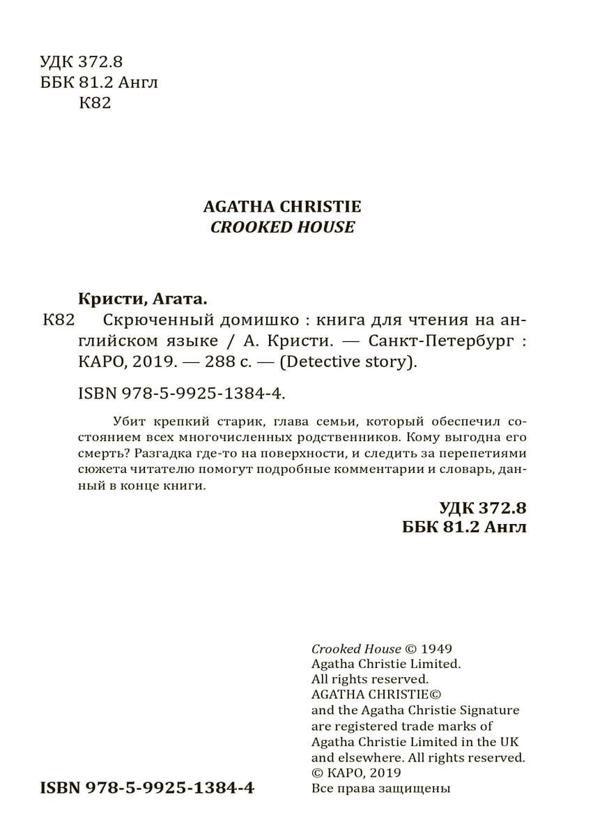 Имя А.Кристи, признанного автора произведений детективного жанра, известно всем. Её перу принадлежит множество подобных историй. Данный роман отличает интересный сюжет, захватывающий с самого начала и не отпускающий внимание до последней страницы этой книги. Неадаптированный текст произведения представлен в полном объёме. Книга содержит комментарии и словарь, что позволяет лучше понимать содержание. Надеюсь, что данное произведение позволит провести время с пользой и удовольствием не только любителям детективов и творчества А.Кристи, но также и тем, кому нравится английский язык и чтение в оригинале. Удачи Вам!