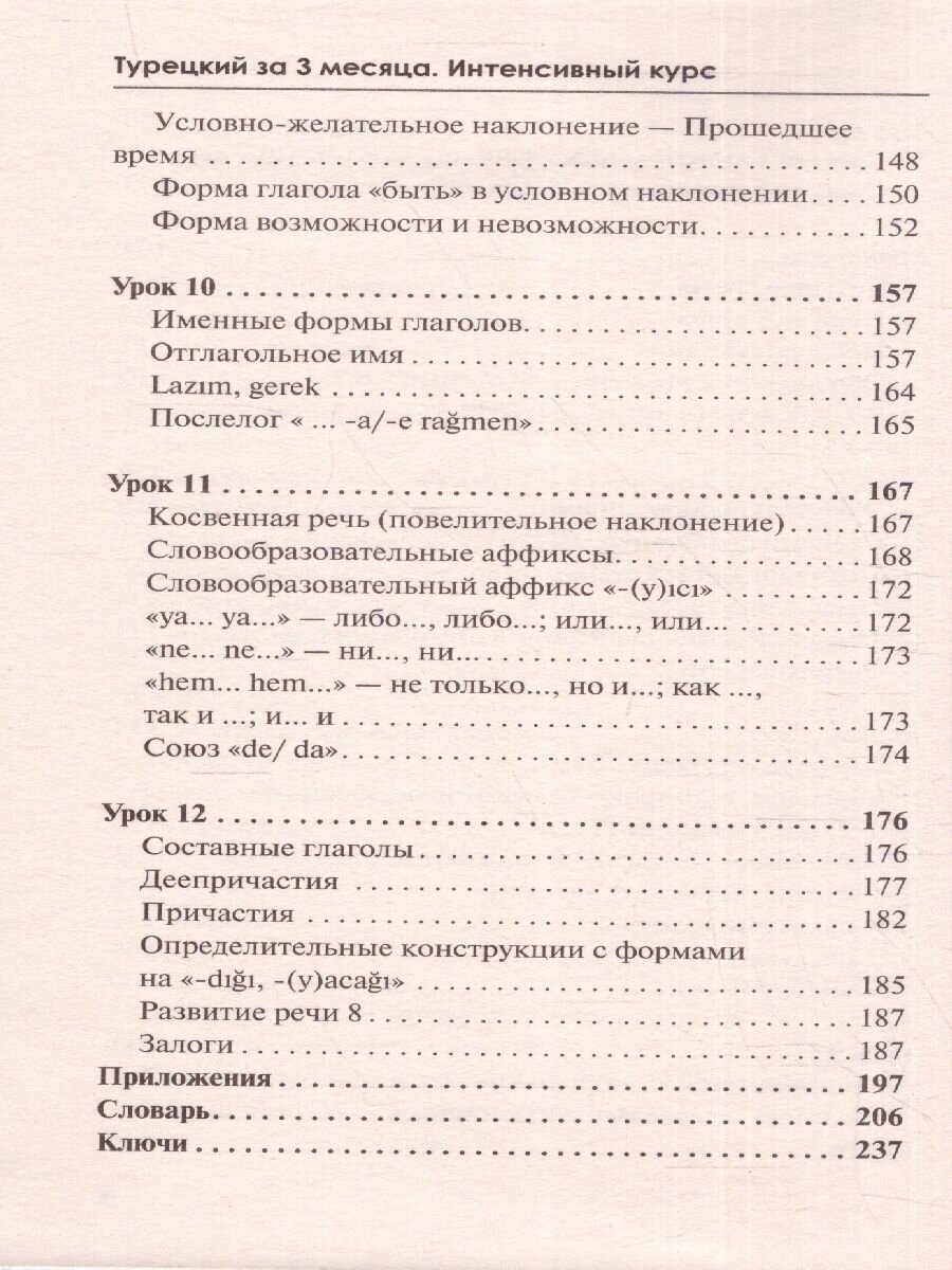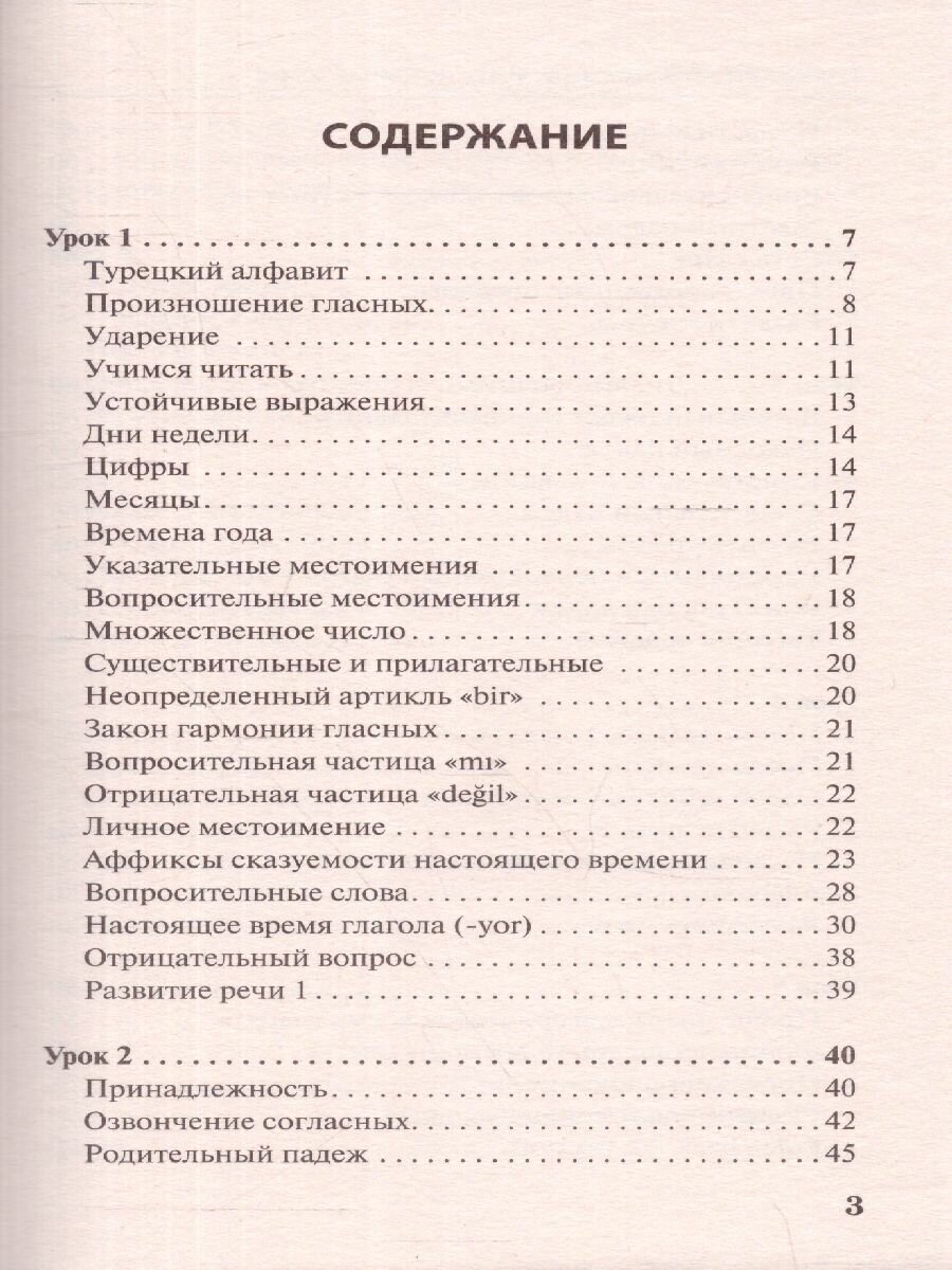 Прекрасная книга для нулевого уровня. Вначале- правила чтения+ слова,написанные по-турецки/как читается русскими буквами/перевод на русский. Даются устойчивые выражения, цифры,месяцы,по типу разговорника. В темах есть упражнения, рассказываются правила грамматики. В конце книги- словарь, опять же с русским произношением!