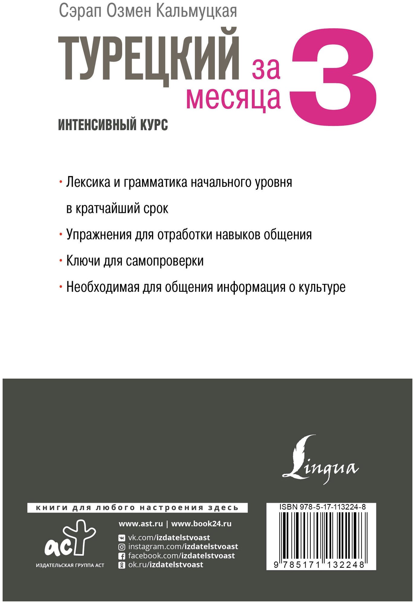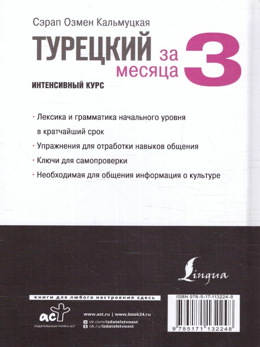 На сегодняшний день товар «Книга: Турецкий за 3 месяца. Интенсивный курс (Кальмуцкая Сэрап Озмен); ИЗДАТЕЛЬСТВО "АСТ", 2019» можно купить с кешбеком в 4 магазинах: book24, Буквоед, Читай-город, Яндекс.Маркет
