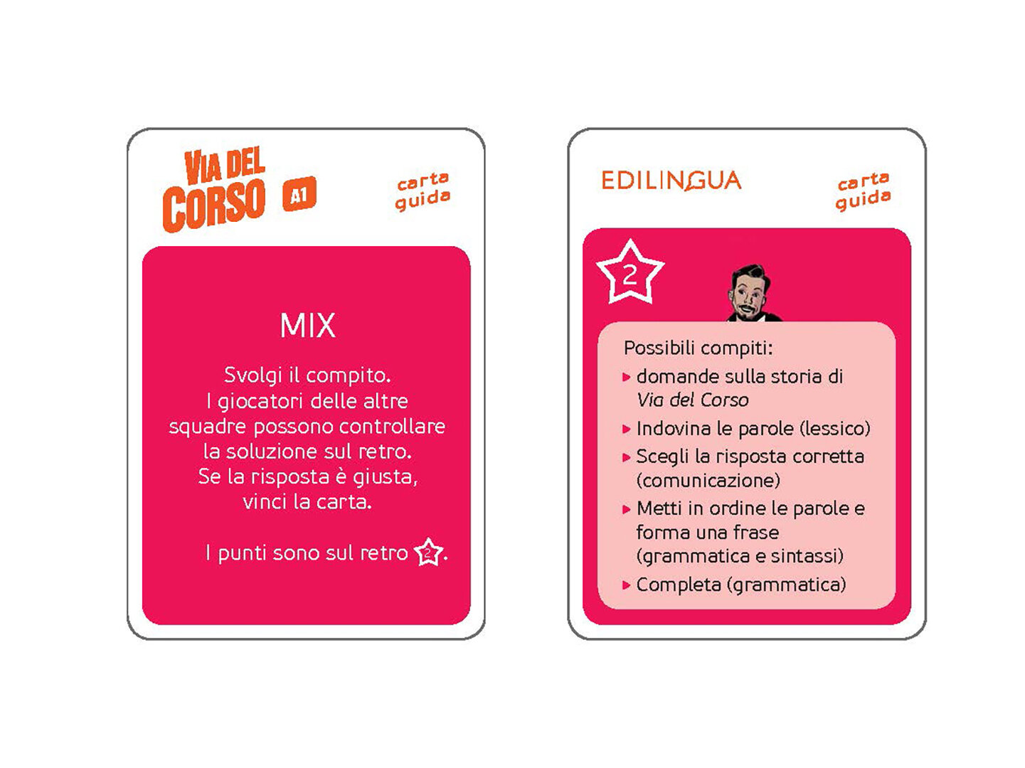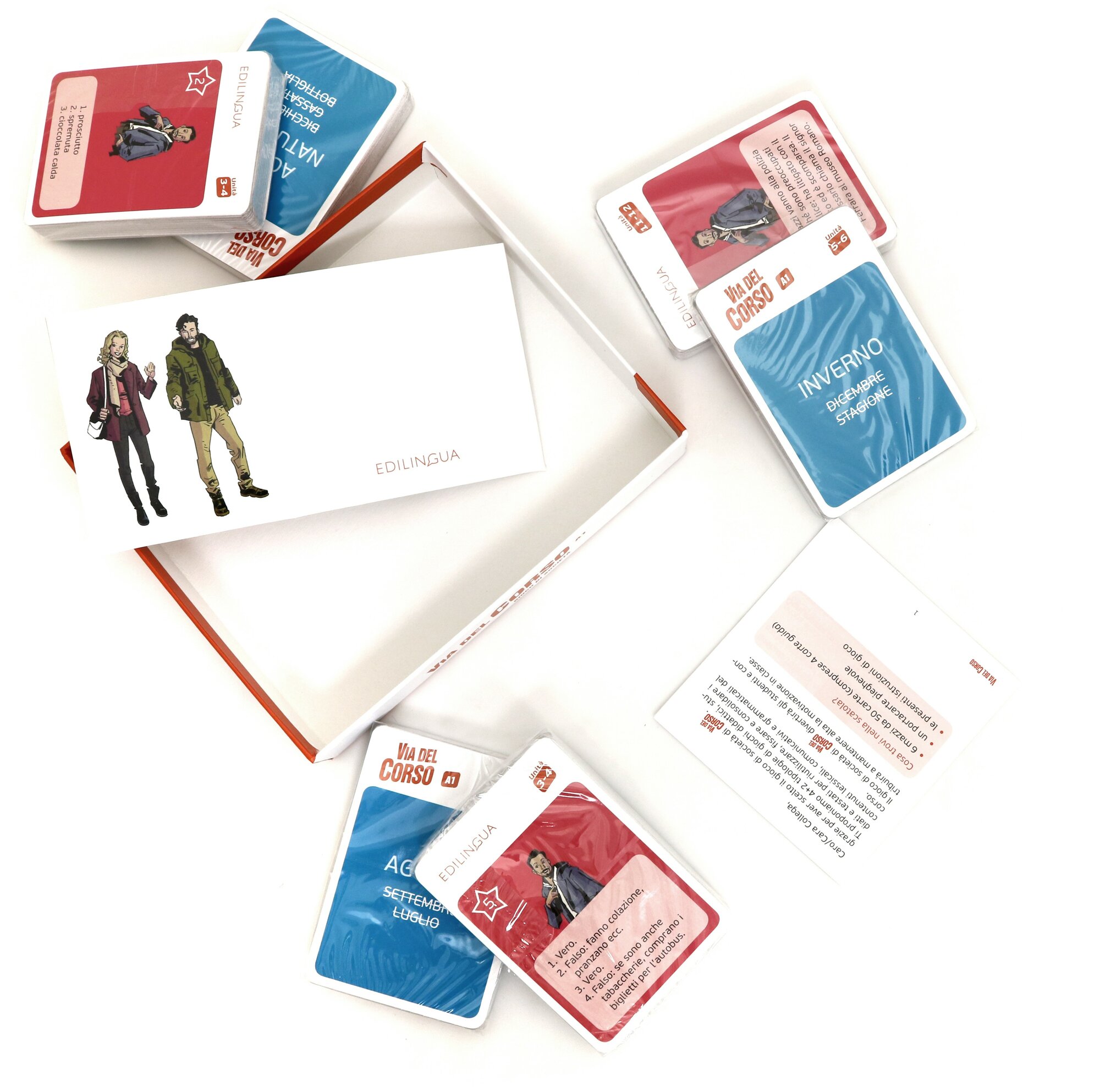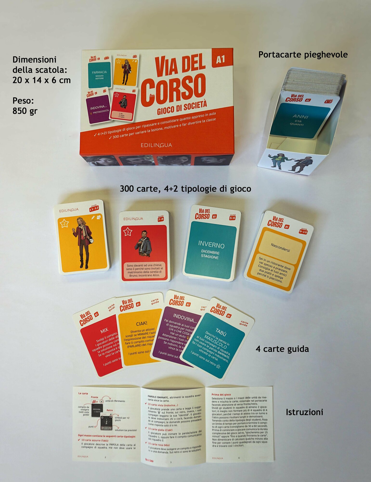 Nella scatola troverete 300 carte (6 mazzi da 50) per giocare a Tabu, Indovina, Ciak!, Mix, Artisti si nasce!, Improvvisiamo; 4 carte guida per far orientare velocemente gli studenti, le istruzioni per voi insegnanti e un portacarte pieghevole.