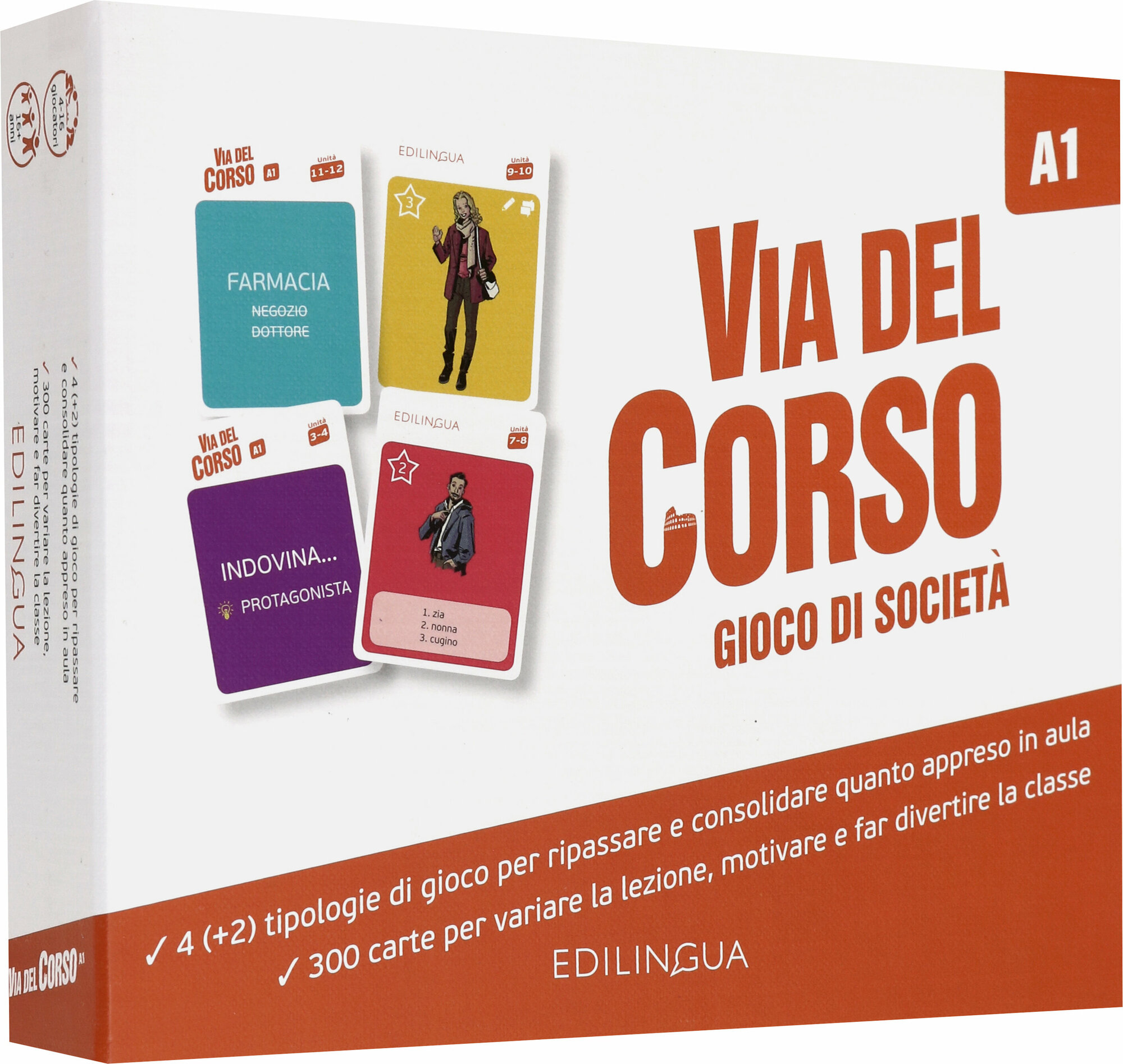 Gioco di societа di Via del Corso A1 e il primo gioco abbinato a un corso di lingua per adulti e giovani adulti.