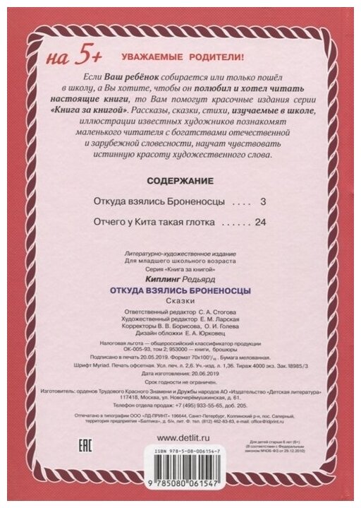 В книгу вошли две сказки Р. Киплинга - "Откуда взялись Броненосцы" и "Отчего у Кита такая глотка".