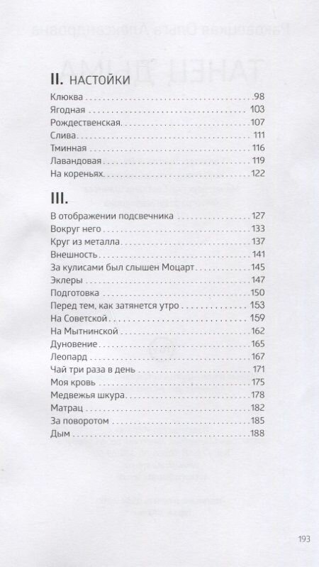 "Танец дыма" отчасти продолжает портреты персонажей с улицы Рубинштейна; героини книги не перестали любить Мариинский театр и Новую Голландию, новых людей и нежные десерты; они путешествуют и неизменно возвращаются в Петербург, где плачут от красоты и неизбежности конца…