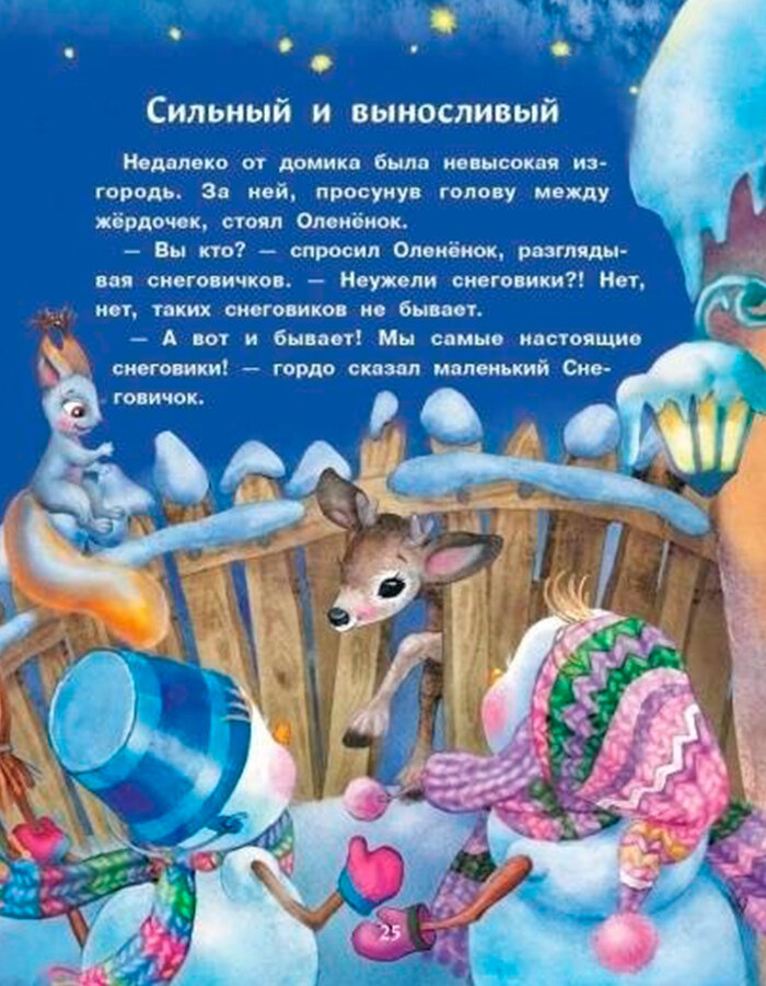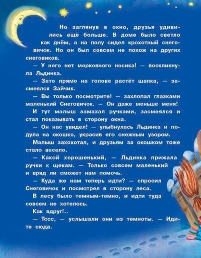Книга замечательная, милая, добрая. Хотели оставить до новогодних праздников, но не удержались и прочитали. Малышка слушала очень внимательно, переживала. Особенно, когда снеговичок провалился в яму). Написано прекрасным языком, просто, понятно и ничего лишнего. А какие картинки - милейшие! Мы подолгу их рассматриваем. Большое спасибо за прекрасные вечера с книгой. Было очень сложно прерываться, но как же приятно вечером снова открыть книгу! А сейчас увидела новую книгу про снеговичка! Ну эту книгу уж точно оставлю до праздника. Будет чудесный подарок малышке