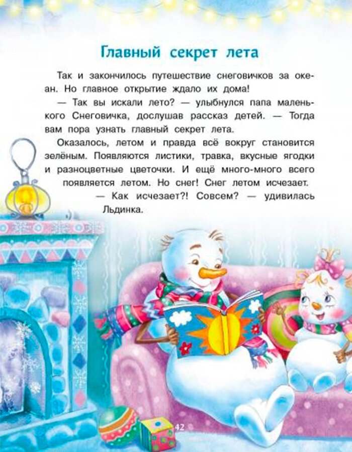 Он, как любой ребенок, очень любопытный и любит повсюду совать свой морковный носик. И как у любого ребенка у него много вопросов. Например, на что похоже лето и где оно прячется зимой? Какие приключения ждут самого маленького Снеговичка и его подругу Льдинку? Обо всем этом ты узнаешь, отправившись с героями книги в новое путешествие. А замечательные картинки сделают это путешествие ярким и незабываемым.