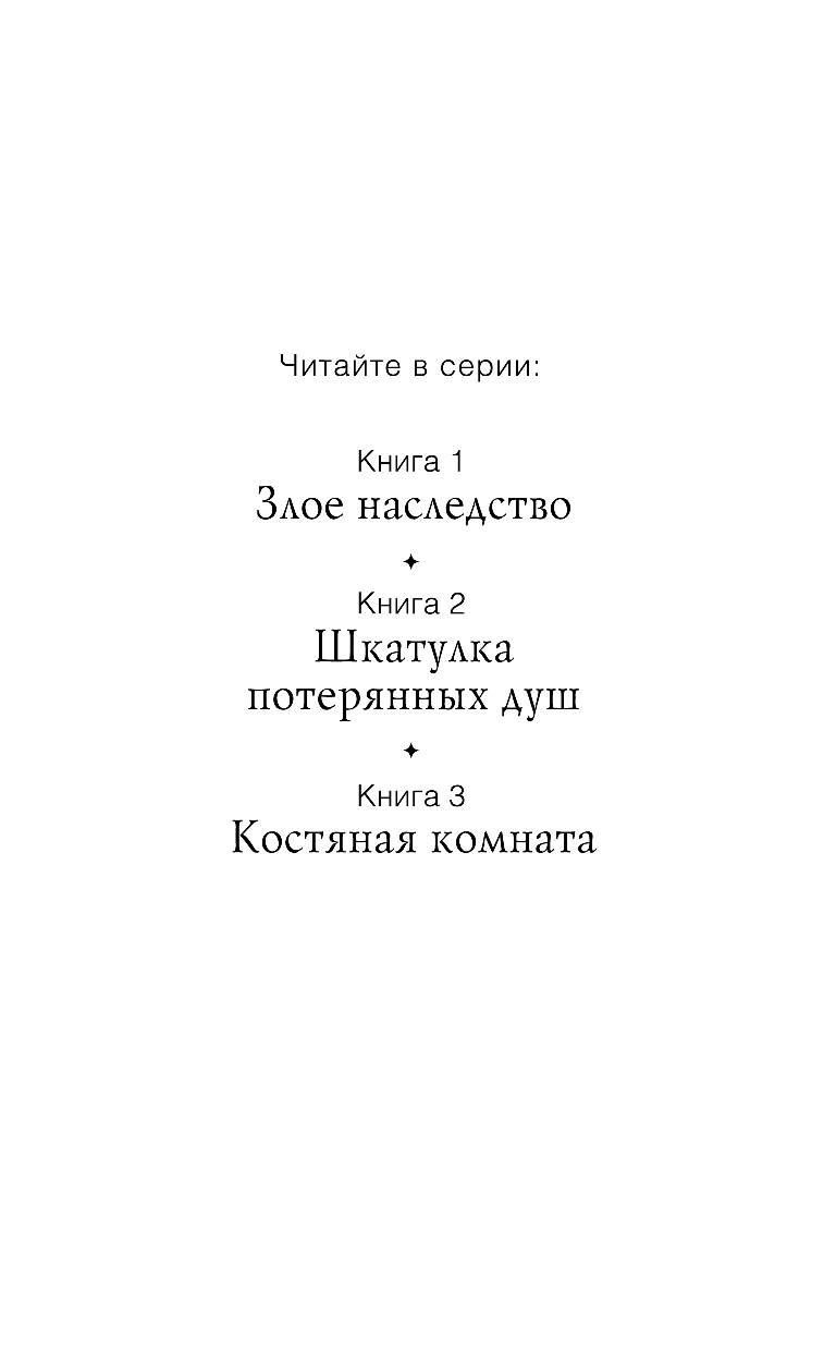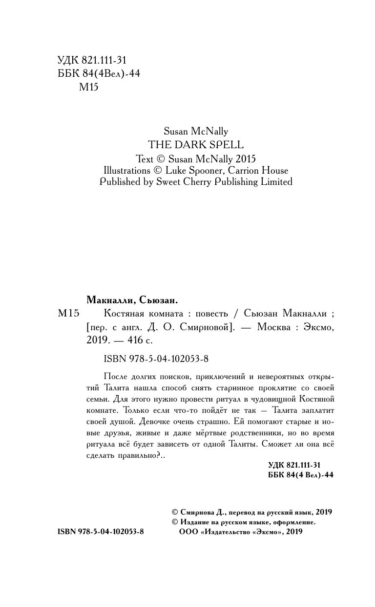 После долгих поисков, приключений и невероятных открытий Талита нашла способ снять старинное проклятие со своей семьи. Для этого нужно провести ритуал в чудовищной Костяной комнате. Только если что-то пойдёт не так - Талита заплатит своей душой. Девочке очень страшно. Ей помогают старые и новые друзья, живые и даже мёртвые родственники, но во время ритуала всё будет зависеть от одной Талиты. Сможет ли она всё сделать правильно?..