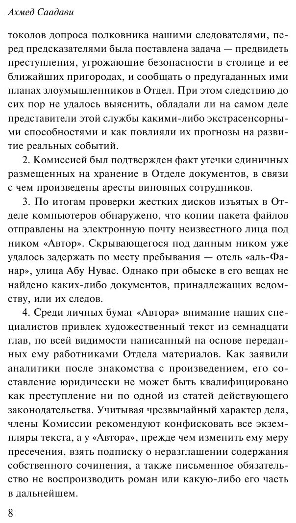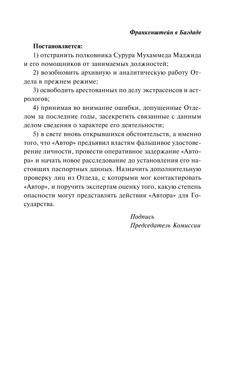 Более 15 лет назад, когда началось вторжение войск НАТО в Ирак, я следил за сводками новостей оттуда, пусть, быть может, и не очень регулярно. Позднее, когда основные боевые действия там как-будто уже закончились, из Ирака продолжали приходить сообщения – в основном о терактах, взрывах, расстрелах в мечетях и на улицах. Но, как ни странно, телевизионные репортажи не передавали всего ужаса происходящего. Этот ужас стал зримым при чтении художественного произведения – романа Ахмеда Саадави. На его страницах предстают люди, обезумевшие от утрат, которые принесло им «освобождение» Ирака, и люди, привыкшие к смерти на улицах. Если в день случилось не больше пятнадцати взрывов, этот день можно считать более-менее сносным.