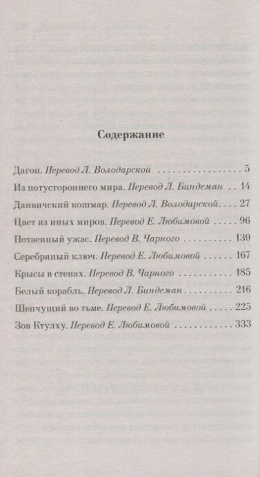 Мое первое знакомство с Говардом Лавкрафтом началось именно с этой маленькой, но очень интересной книги! Десять невероятно атмосферных и жутких рассказов скрасили мне начало отпуска! Насколько же эффектно и всеобъемлюще Лавкрафт описывает древнее и инопланетное зло...Насколько каждый рассказ погружает в пучину страха и безысходности . Это великолепная книга, знакомство с автором удалось на 100 процентов!