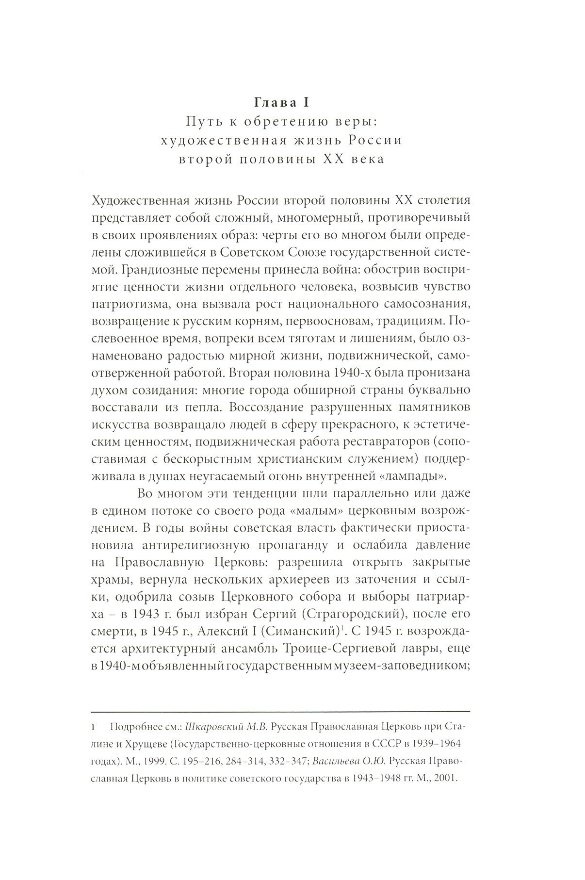 В книге анализируются постепенное вхождение в полотна узнаваемых христианских мотивов (храма, иконы, предстояния, трапезы и др.), во многом связанное с возрождением интереса к древнерусскому искусству, работа над отдельными евангельскими сценами, а также духовные искания в беспредметном творчестве и библейские сюжеты в живописи художников-нонконформистов.