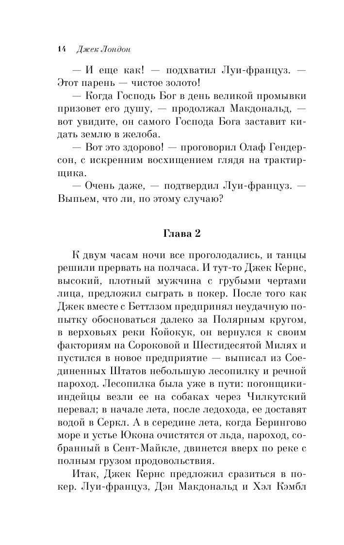 Интересный роман, который можно разделить на 3 части- первая, это жизнь Харниша в приисковом поселке и его юные годы, вторая- зрелость и становление богатым и властным человеком и третья это то, каким он становится под влиянием любви к женщине и как это отражается на его жизни. Повествование захватывает. С большим интересом наблюдала за изменениями в характере и личности главного героя. Элам Харниш яркий, эмоциональный и целеустремленный, автор наделил его невероятной волей и физической силой с единственным страхом- страхом перед Женщиной. Но он с достоинством и, присущим ему упорством, поборов страх решает добиться своего счастья и женщины, которая ему дорога, поставив на карту всё.