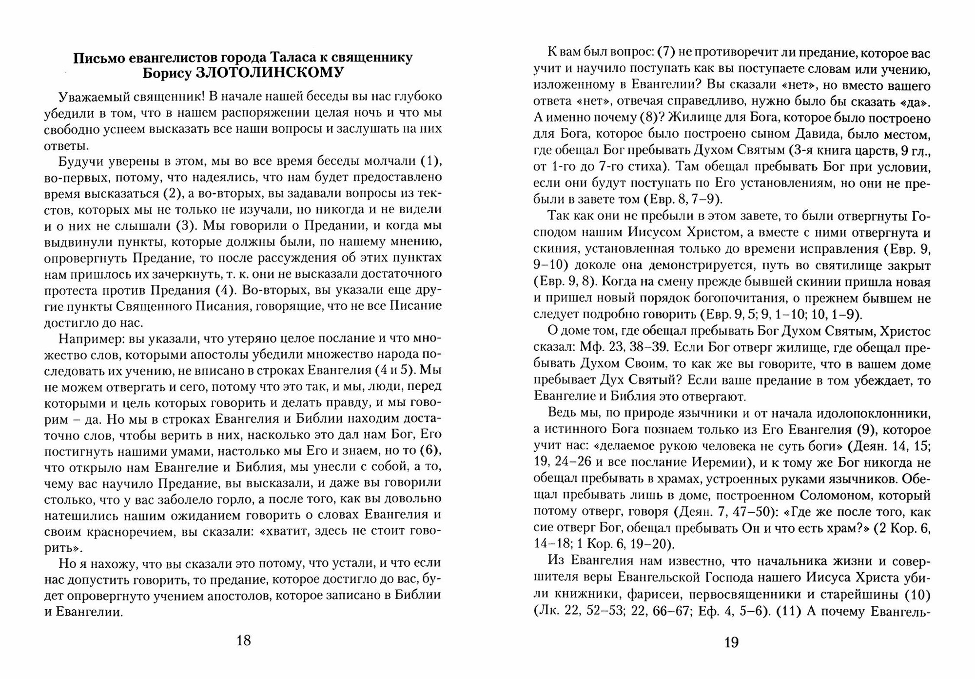 В книге архиепископа Василия (Злотолинского), бывшего епископа Симферопольского и Крымского (1990-1992 гг.), архиепископа Запорожского и Мелитопольского (1992-2009 гг.), составленной им по материалам миссионерских бесед с баптистами в его бытность священником в Средней Азии, красноречиво и убедительно отстаиваются постулаты христианской веры, на основании Священного Писания доказывается истинность духовных канонов Православия.