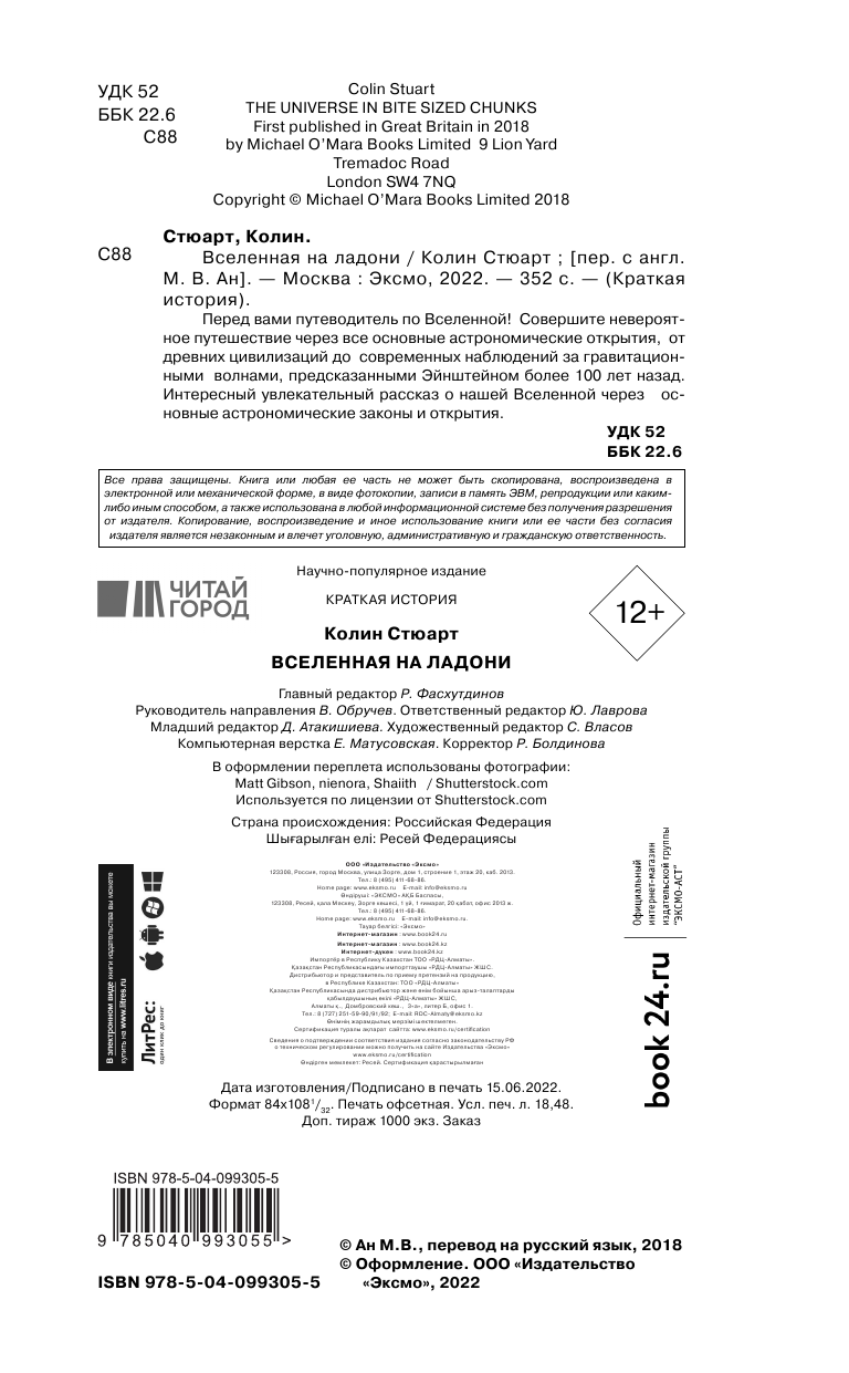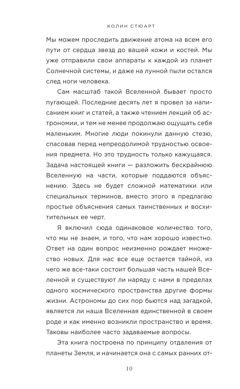 Интересная и увлекательная книга по астрономии и космологии. В ней доступным и популярным языком описаны основные знания о космосе и Вселенной. Книга состоит из шести глав. В первой главе описана история развития астрономии, во второй - наша планета, Луна и Солнце, в третьей описаны планеты Солнечной системы, в четвёртой - звёзды, их эволюция, а также чёрные дыры, туманности и экзопланеты, в пятой - галактики, ассоциации галактик и проблема внеземной жизни, в шестой - Вселенная и её эволюция. Книга сделана довольно качественно, белая офсетная бумага, чёрно-белые иллюстрации. Рекомендую к прочтению всем, кто интересуется астрономией и космологией.