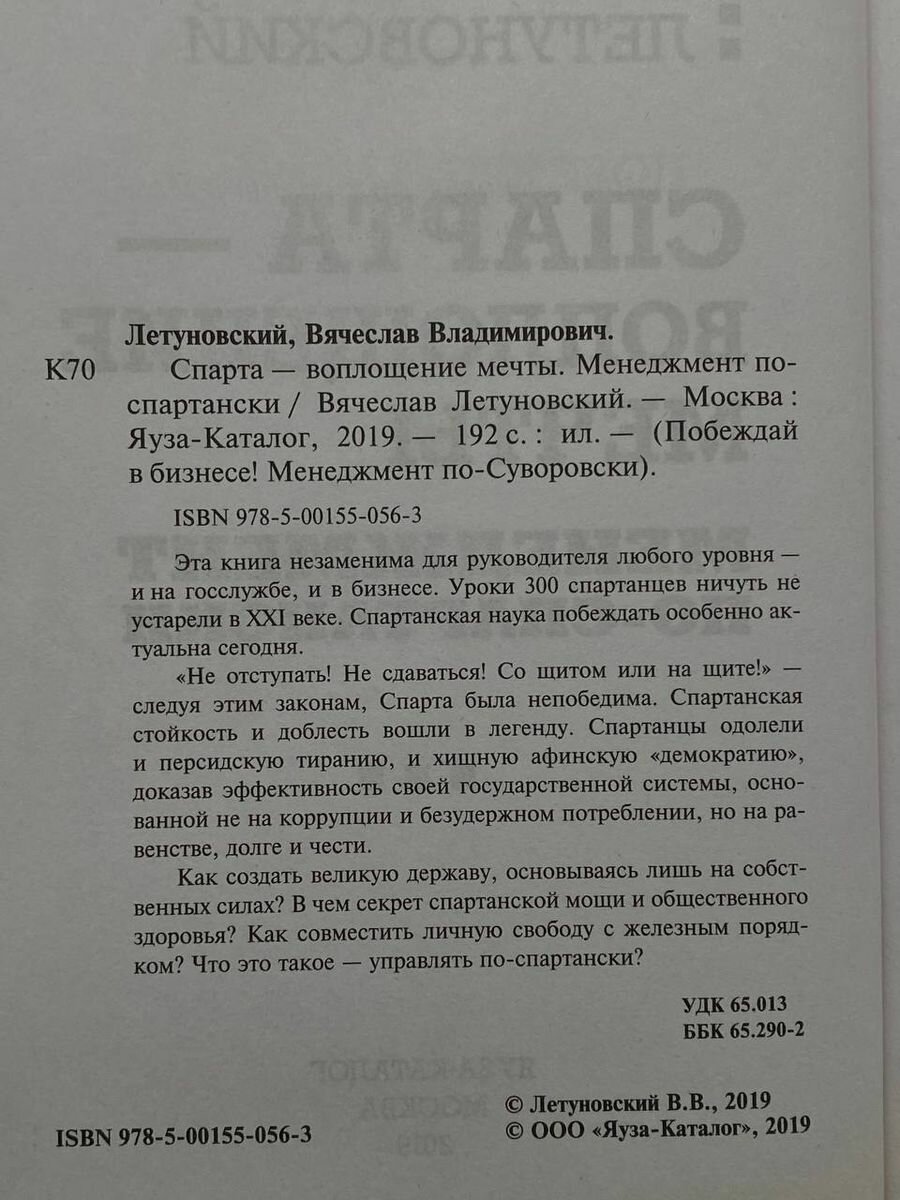 Спарта - воплощение мечты. Менеджмент по-спартански (Летуновский Вячеслав Владимирович); Издательство Яуза ООО, 2019