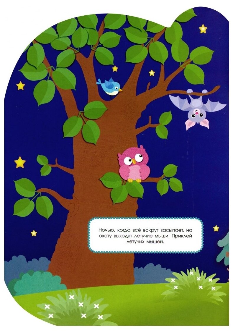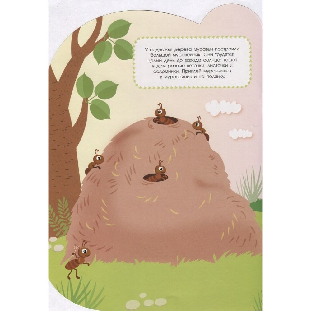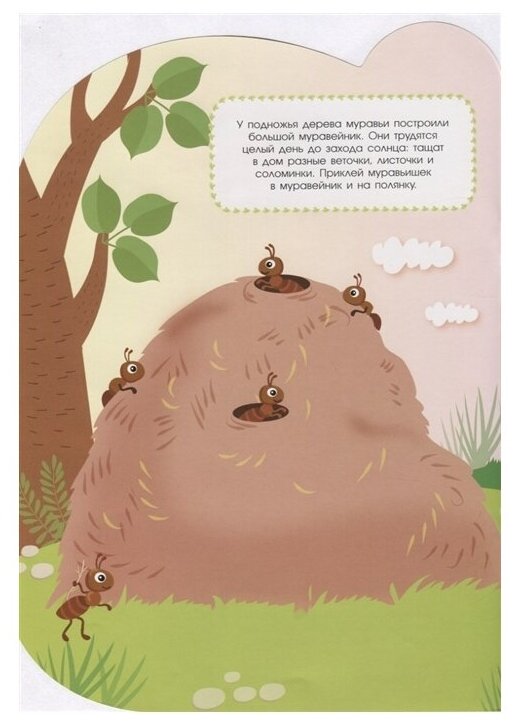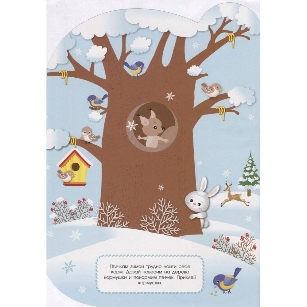 На поляне возле леса стоит большое раскидистое дерево. Тихо шелестят листочки, сменяют друг друга зима, весна, лето и осень. А рядом с деревом кипит жизнь. Давай вместе посмотрим, что происходит вокруг. А наклейки помогут нам в этом.